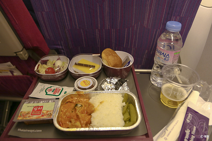 그렇게 영화를 보고 있는데 어디선가 맛있는 냄새가 나기 시작했다. 안 그래도 영화가 영화인지라 슬슬 배고프기 시작했는데 타이밍 좋게 기내식 타임이라니. 나는 돼지고기가 들어있는 기내식을 골랐다. 타이항공은 처음인지라 탑승전 기내식 등 이것저것 찾아보니 돼지고기는 호불호가 갈린단다. 나는 극호! 카레맛도 나고 김치도 주고 딱 좋았다. 그러나 이외에 케이크는 단것을 좋아하는 내 입맛에도 너무 달았고 빵은 맛없었다. 그래도 괜찮아, 메인 디쉬가 맛있잖아.