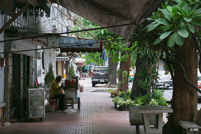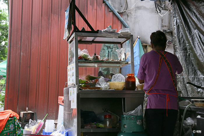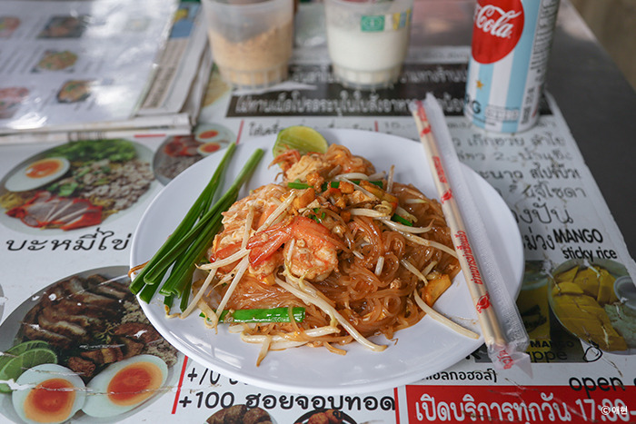 기운이 빠져서 그런지 갑자기 허기가 몰려왔다. 그리고 도착 전까지만 해도 좋던 날씨도 무덥게 느껴졌다. 뭐라도 먹어야 할 것 같아 주변을 둘러보았으나 마땅한 곳이 없었다. 이 라인에서는 별 소득이 없겠다 싶어 길을 건너려던 순간, 횡단보도 옆 노점에서 팟타이를 먹는 외국인들이 보였다. 여기다! 마침 빈자리도 있어 자리에 앉음과 동시에 콜라와 팟타이를 주문했다. 애초에 '점심은 팟타이'라고 정해두었기에 다른 메뉴는 보이지도 않았다. 땀은 계속 흐르고, 팟타이보다 먼저 나온 콜라는 미지근했지만 그래도 끼니를 때울 수 있으니 만족한다. 팟타이는 전혀 기대하지 않았는데 생각보다 맛있었다. 팁싸마이의 오렌지주스도, 시원한 에어컨도 없었지만 맛있으니 다 되었다. 팁싸마이보다 더 괜찮았던 것 같기도 하다. 꿩 대신 닭이 아니라 닭 대신 꿩.