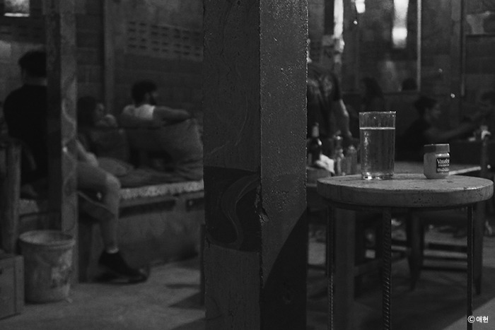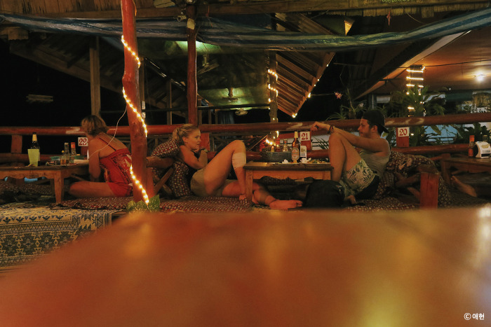 방비엥 거리는 술로 넘실대는데 우리만 이대로 자기가 아쉬워 맥주를 마실 수 있는 또 다른 바를 찾기 시작했다. 이 골목 저 골목을 돌았으나 결국 간 곳은 숙소 근처에 있는 <제이디바 JD bar>. 여기도 여행자들로 북적대기는 했으나 여느 바처럼 문란한 분위기는 아니라서 좋았다. 시끄럽게 게임을 하는 무리가 있었는데 그들도 곧 조용해졌고. 우리도 방비엥의 술병을 든 여행자가 되었다.