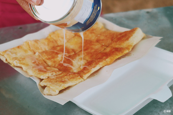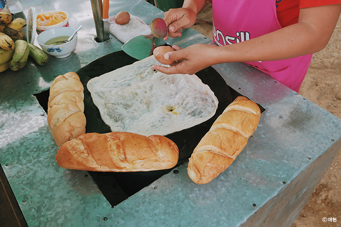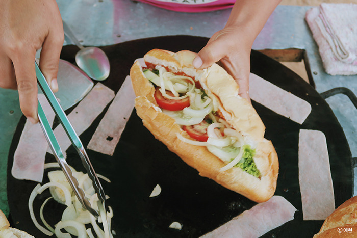 길을 걷다 발견한 유명한 샌드위치! 「꽃보다 청춘」의 그들도 먹었고 방비엥에 다녀온 모든 블로거들이 먹었던 그 샌드위치. 혼자 먹기엔 컸지만 첫날이니까 모두 하나씩 들고 먹었다. 그리고 그게 처음이자 마지막 샌드위치였다. 엄청나게 맛있지도 않았고 하나를 다 먹기엔 느끼했다. 샌드위치에 기대가 너무 컸기 때문에 조금은 실망했다.