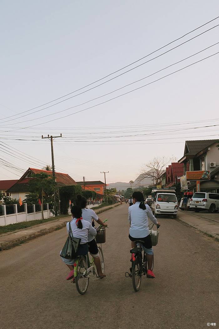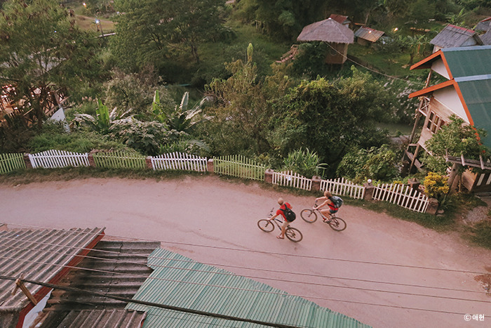 테라스로 나와 아래를 내려다보면 자전거를 타고 달리는 외국인들을 여럿 볼 수 있었다. (이때만 해도 자전거를 탈 줄 몰랐는데 지금처럼 쌩쌩 잘 탈 줄 알았다면 저들처럼 자전거를 타고 방비엥 골목을 누볐을 거다.)
