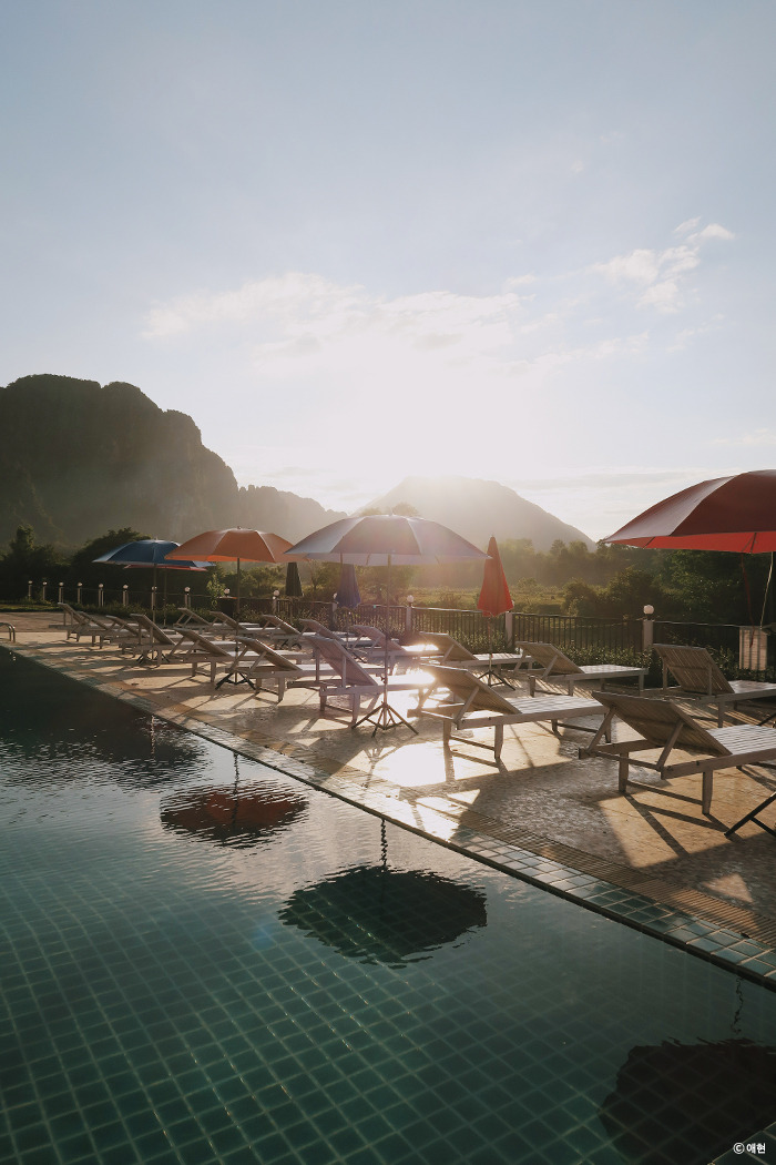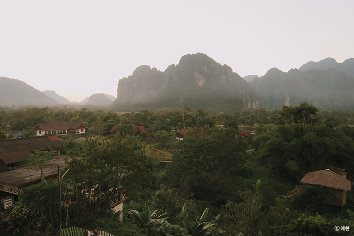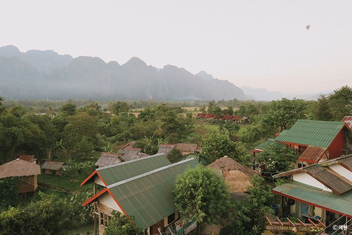 라오스에서 우리의 두 번째 숙소는 방비엥 안쪽 골목 한 모퉁이에 자리하고 있는 <마운틴뷰 리버사이드 부티크 호텔>. 처음 구글 지도에 검색했을 때 블루라군으로 가는 길 입구로 나오길래 그곳으로 갔는데 그곳은 호텔이 아닌 ‘미운틴 뷰 리버사이드 부티크 리조트’였다. 이름이 똑같아서 착각했네. 어쩐지 우리가 결제한 금액보다 훨씬 더 고급 져 보이더라니. 거기서 더 걷고 걸어 나온 우리 호텔은 뷰가 참 좋았다. 테라스로 나오면 이런 푸름이 드넓게 펼쳐져 있었다. 프런트 직원도 좋았는데 그는 우리가 루앙프라방으로 떠나는 그 순간까지 참 친절했다. 다만 이 호텔에서 아쉬웠던 건 화장실. 화장실 문이 잘 잠기지 않았고 지저분했다. 그래도 따뜻한 물은 콸콸콸 잘 나왔다.