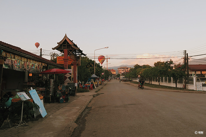 호텔 주차장에서 나와 5분도 채 걷지 않아 나타난 방비엥의 메인 로드. 모든 길은 로마로 통한다는 말처럼 방비엥에서의 모든 길은 이 길로 통한다. 이 길에 들어서자마자 마음이 놓였다.