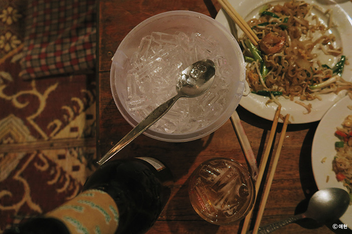 어쨌든 우리도 그 유명 하디 유명한 프렌즈 펍 한 곳에 자리를 잡았다. 드라마는 보지 않을 거지만 분위기는 느끼고 싶으니까. 맥주와 쌀국수, 팟타이, 계란 볶음밥을 시켰는데 맛에 대한 평가는 '팟타이가 아주 맛있다'고만 적어둔 걸 보니 다른 건 그냥저냥 먹을만한 정도였나 보다. 아, 사진을 보니 떠오르는 작은 에피소드 하나. 우리의 맥주가 (여기서 맥주는 역시 비어라오) 시원하지 않아 얼음을 부탁했더니 쿨하게 얼음 통을 하나 턱 주고 갔다. 얼음을 뜰 수 있는 숟가락도 함께. 이게 뭐라고 얼음통을 보며 킬킬 웃어댔다.