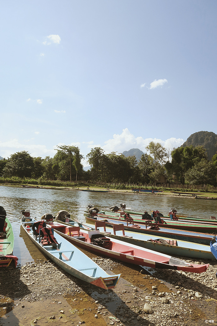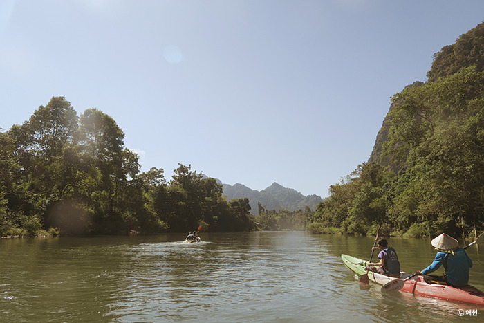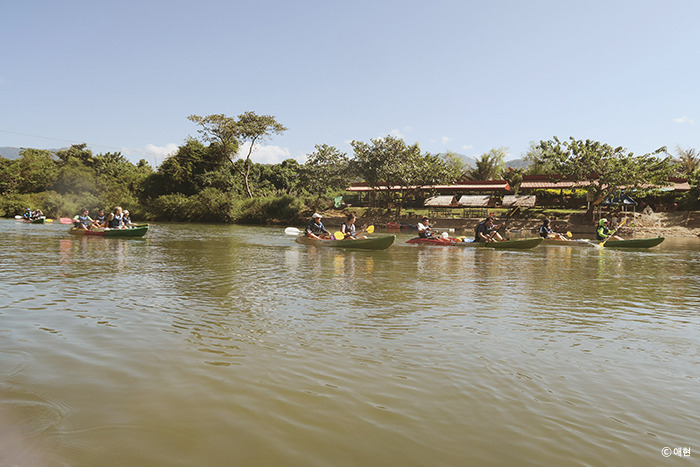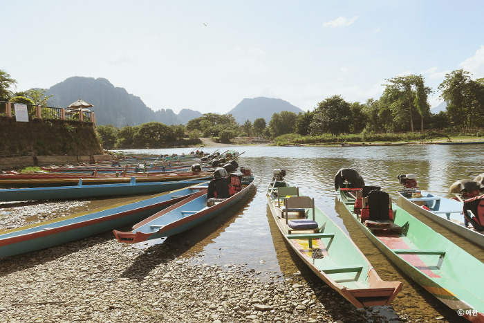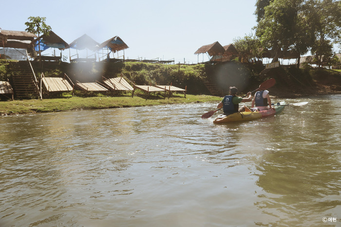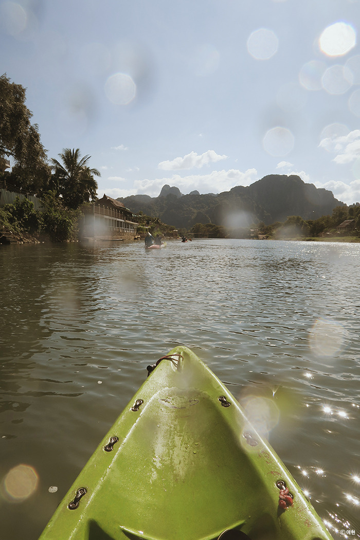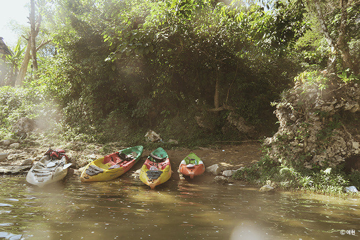 어느덧 종점 도착! 종점에는 우리가 탔던 것과 달리 뒤에 모터가 달린 카약이 있었다. 이거면 좀 더 편했을 텐데 (나 말고 가이드가). 종점에서 대기하다가 드디어 기다리고 기다리던 블루라군에 갔다. 블루라군에 대해 미리 적자면 나는 블루라군보다 카약킹이 훨씬 더 좋았다. 모두가 '라오스의 방비엥'하면 블루라군을 말하기 때문에 그 기대가 어마어마하게 커지는데 늘 그렇지 않은가. 기대가 크면 실망도 큰 법. 블루라군의 대한 이야기는 다음에 하고. 대신 기대하지 않았던 카약킹이 정말 좋았다. 기대를 하지 않은 것이 즐거우면 그 즐거움은 배가 되기 때문일까. 나는 감히 말한다. 방비엥의 꽃은 블루라군이 아닌 카약킹이라고.