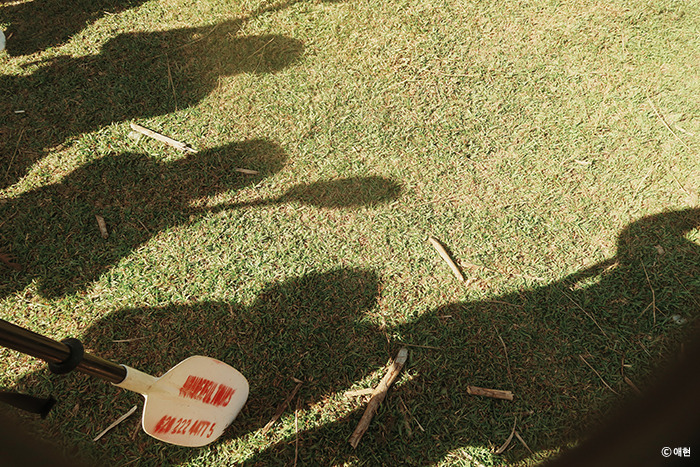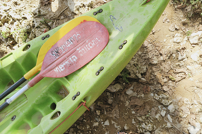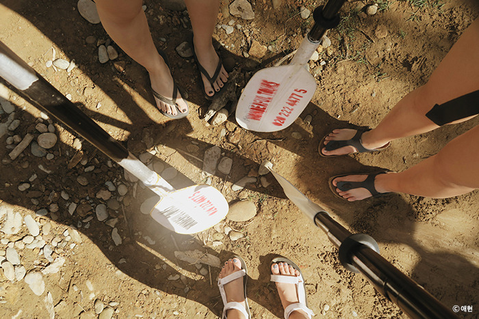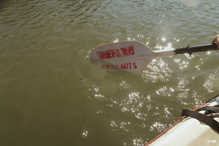 볼 때는 쉬워 보였으나 막상 시도하니 굉장히 힘들었던 노젓기. 일단 노 자체가 무겁다. 얼핏 보기엔 가벼운 플라스틱 같았는데 노를 받아 드는 순간 '억'소리가 난다. 그 노를 젓는 것은 더 힘들다. 나는 온몸에 힘이라곤 없는 사람이라 노를 젓는 것 자체가 고된 노동이었다. 처음 6km를 타고 내려갈 때는 J가 앞에 앉아 노를 젓다가 점심을 먹고 다시 4km를 내려갈 때는 내가 앞에 앉았는데 힘이 들어가지 않아 중간중간 J에게 노를 넘겼다. 아 나약하고 쓸모없는 인간이여.