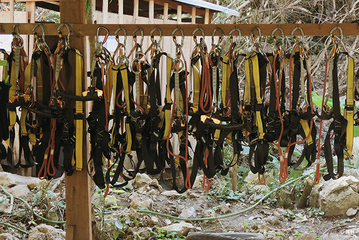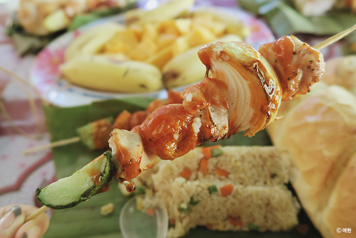 짚라인을 탈 사람은 저 위로 사라지고 우리는 밥을 먹으러 왔다. 원터풀 투어에서 준비한 점심은 나뭇잎에 싼 주먹밥 한 덩어리와 라오스에서 질리도록 먹었던 바게트 빵 그리고 바비큐 두 꼬치! 여기에 디저트로 먹을 수 있는 바나나와 망고처럼 생긴 과일도 나왔다. 그런데 이상도 하지? 바비큐 꼬치인데 왜 바비큐보다 채소가 더 많은 걸까? 그래도 맛있게 잘 먹었다. 특히 주먹밥은 너무 맛있어서 하나 더 먹고 싶었다.