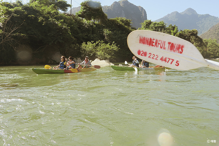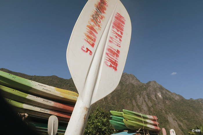 그러나 사실 여기서 여행자들의 노젓기는 필요 없다. 카약은 거의 가이드의 힘으로 내려가는 것이나 다름없다. 우리는 그냥 노젓기를 체험하는 정도에 불과하다. 가이드가 노를 젓고 방향을 잡는 대로 따라가다 다른 카약에서 가이드가 물을 뿌리면 그 물을 맞고 사진이나 찍으며 유유자적 놀면 된다. 이때 가이드에 따라 액티비티함의 정도가 달라진다. 내 가이드가 다른 가이드랑 친하고 장난기가 많다? 그럼 카약을 타는 내내 다른 카약이 뿌리는 물을 엄청 맞는다고 생각하면 된다. 나도 물을 엄청 맞아서 복수한다고 노를 휘저어봤지만 정말 단 한 번도 물을 뿌리지 못했다. 숙연.