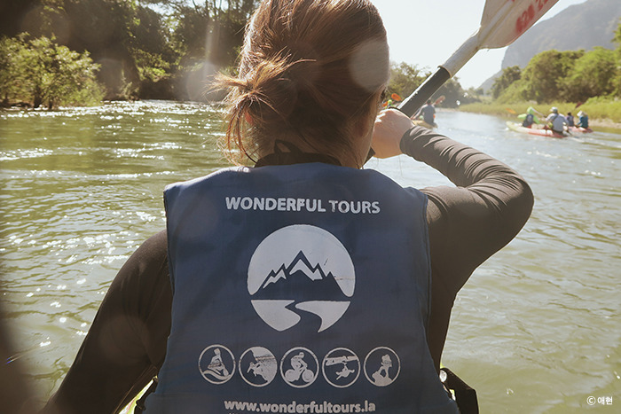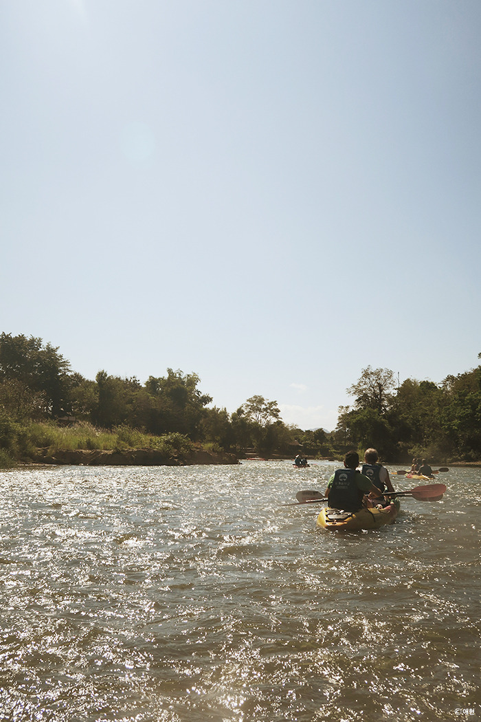 강가에 도착하자마면 구명조끼와 노를 나눠준다. 직원이 사람들이 구명조끼를 제대로 잘 입었나 확인하는 짧은 시간을 놓치지 않고 사진을 찍는다. 빛이 아주 좋았다. 모두의 구명조끼를 확인한 직원이 사람들을 불러 모은다. 물론 영어로. 그리고 모인 사람들에게 간단하게 카약 타는 법을 알려준다. 노를 젓는 법과 카약을 탄 후의 주의사항 등을 알려주는데 이도 물론 영어로 알려주기 때문에 나는 아무것도 알지 못한 채 카약을 탄다. 괜찮아 나는 몰라도 나랑 같이 타는 사람은 알아들었겠지. 모든 준비가 끝나면 2인 1조로 카약을 타는데 모든 카약에 직원이 1명씩 같이 타기 때문에 사고가 날 가능성이 90%는 줄어든다. 이때, 나는 카약킹을 해본 적이 있다고 하면 여행자의 선택에 따라 직원이 동승하지 않기도 한다.