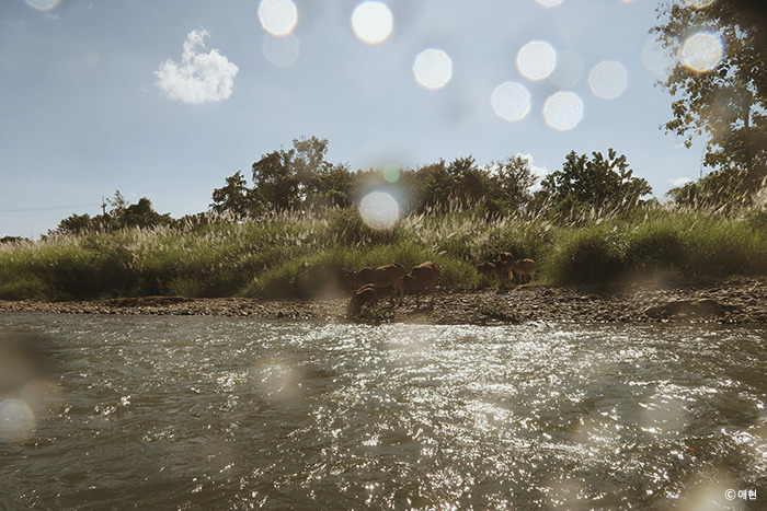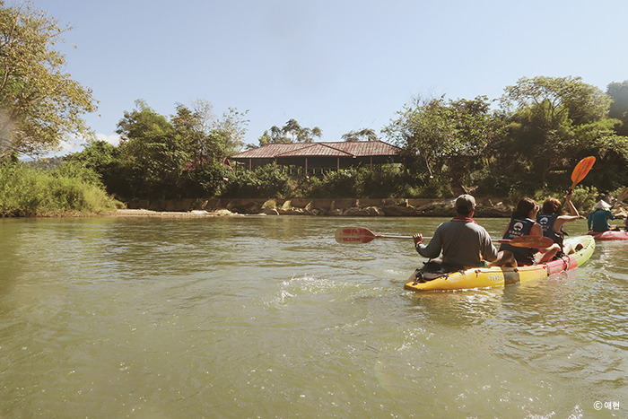 밥 먹고 햇볕에서 옷을 말리며 쉬다가 다시 카약을 탔다. 6km 구간의 풍경 속에는 키 높은 나무들이 주를 이뤘는데 4km 구간은 나무보다 풀숲이 많았가. 그리고 그 풀숲에는 소가 참 많았다. 가만 생각해보면 여기뿐 아니라 라오스 자체에 소가 많았다. 버스틑 나고 지나가다가도 소, 카약 타고 가다가도 소.