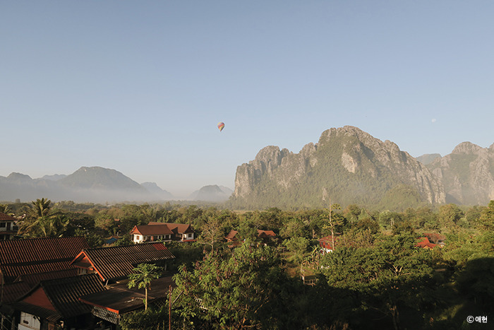 우리끼리 앙케이트, 라오스에 와서 가고 싶은 곳 1순위 블루라군! 오늘은 그 블루라군에 가는 날. 일어나자마자 테라스로 나가 방비엥의 풍경을 한껏 만끽했다. 이른 아침부터 방비엥의 하늘에는 열기구가 떠오른다. 부지런한 열기구(를 타는 사람들).