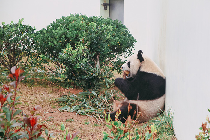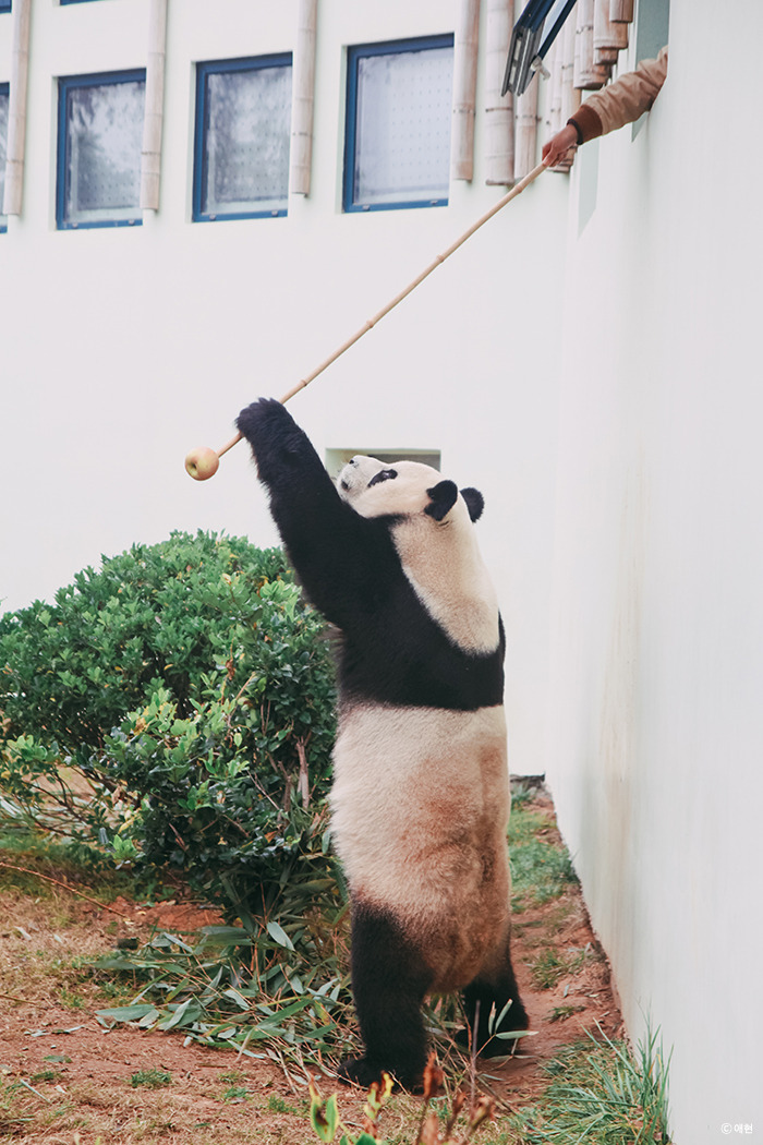 느릿느릿 그 짧은 거리를 이동하면서도 몇 번을 쉬며 가더니만 사과는 나름 재빠르게 낚아챘다. 그런데 또 덩치와는 다르게 사과 한 알을 엄청 느리게 먹었다. 판다가 사과를 먹는 내내 사육사가 판다를 내려다보며 다음 사과를 들고 대기하고 있었다. 글쎄, 과연 판다가 오늘 안에 저 사과를 다 먹을 수 있기는 할까.