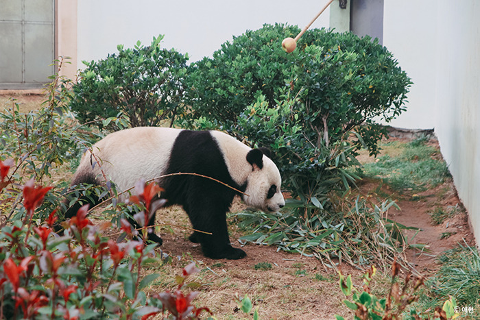 판다를 따라 고개를 돌려보니, 그럼 그렇지, 사육사가 사과로 판다를 유인하고 있었다. 억지로 판다를 움직이게 하는 거 아닌가 싶었는데 생각해보니 이렇게라도 하지 않으면 판다는 하루 종일 움직일 것 같지 않았다.