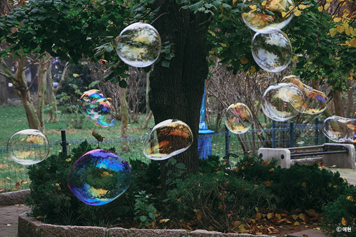 <중산공원>에 들어서자마자 어디선가 날아오는 커다란 비눗방울에 시선을 빼앗겼다. 비눗방울을 따라가다 보니 비눗방울을 불고 있는 아주머니와 그 옆에 잔뜩 쌓여있는 비눗방울 기계가 보였다. 친구가 몹시도 탐냈지만 생각보다 비싸기도 했고 이 공원을 나서는 순간부터 짐이 될 것임을 알기에 친구를 이끌고 자리를 옮겼다. 중국다운 스케일로 꽤 커다란 비눗방울을 뿜어내 더 지켜보다간 나 역시도 충동구매를 할 것 같아 정말 도망치듯 공원 안으로 들어갔다.