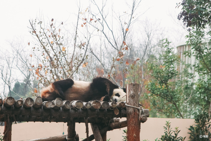 그럼에도 판다는 보고 싶어 부지런히 발을 놀려 자이언트 판다의 우리로 갔다. 그렇게 만난 판다는 아주 게을렀다. 마치 주말의 나처럼 퍼질러 누워서는 조금의 미동도 없었다. 그러더니 갑자기 몸 여기저기를 박박 긁는다. 그리고 또다시 미동도 없이 가만히 누워있었다. 그렇게 얼마나 시간이 흘렀을까. 누워있던 판다가 벌떡 일어나 앉더니 갑자기 구르듯 계단을 내려오기 시작했다. 쉴 만큼 쉬었다는 건가!