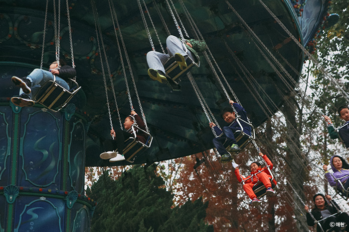 놀이공원이라는 이름에 걸맞게 놀이기구도 몇 있었는데 그중 가장 재미나 보였던 건 회전 그네. (놀이공원을 좋아하는 편이 아니라 자주 가지 않아서인가 정확한 명칭을 모르겠다.) 이 밖에도 귀신의 집, 금붕어 잡기 등이 있었으나 그 규모가 크지는 않았다. 아주 작은 소도시의 곧 없어질, 마지막 개장날의 놀이공원 같았다. 그리고 서글프게도 내가 세 번째로 이곳을 방문했을 때 놀이공원의 모든 놀이기구는 멈춰있었다. 이 사진을 찍을 때만 해도 몰랐지. 2년 뒤 이 놀이기구에는 아무도 타지 않을 것이란 걸.