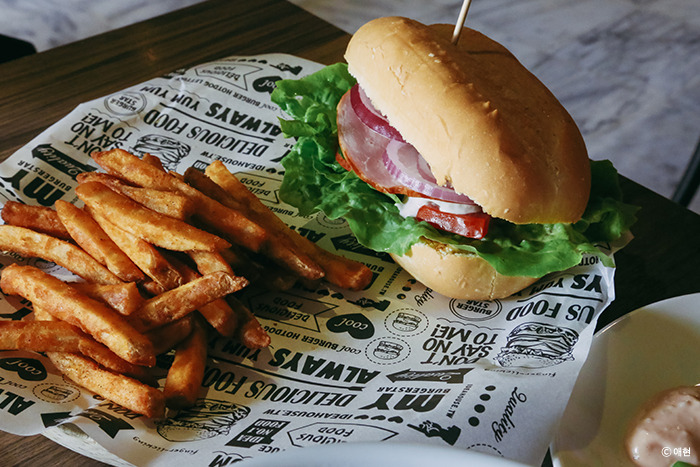 메인 요리 선택의 시간. 나는 우육면을, P는 버거 세트를 시켰다. 간단하게 나올 줄 알았는데 제대로 된 한 끼네. 우육면은 향신료나 고기의 냄새가 심하게 나지 않아 무난하게 먹기 좋았다. 나는 고수만 아니라면 그 어떤 향신료가 들어가도 맛있게 먹는 편이지만 나와 정반대의 사람이라도 먹을 수 있을 것 같다. 이 호텔 여러모로 마음에 든다!