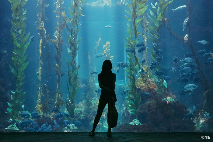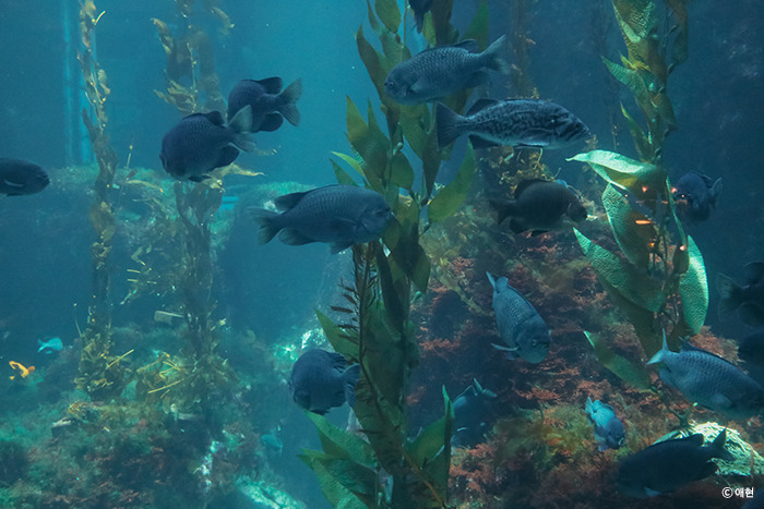 열쇠고리가 나오기까지는 삼십 분에서 한 시간 가량 걸린단다. 열쇠고리를 기다릴 겸 아직 가지 않은 마지막 심해관으로 향했다. 여기서 펭귄도 보고 커다란 수초 수족관 앞에서 사진도 찍어야지. 이런저런 물고기들을 보며 걷다 보니 드디어 수초 수족관의 흔적이 나타났다. 크게 빙 둘러 내려가자 거대한 모습이 드러났다. 여기선 꼭 사진을 찍어야 해.