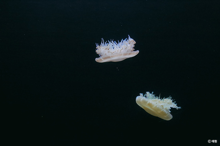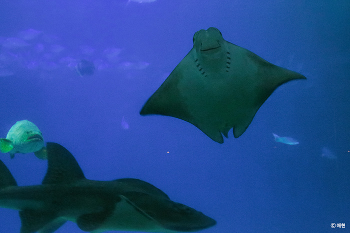 크기 때문인지 아니면 그 아름다움 때문인지 그것도 아니면 SNS용 인증샷 때문인지 다들 이 앞에서 사진을 찍고 있었다. 나는 이 모든 이유로 사진을 찍고 싶었다. 수족관이 꽤 거대하지만 괜찮은 그럴싸한 사진을 얻으려면 그 앞에 아무도 없어야 하기에 오래 기다리고 또 기다려 몇 번의 시도 끝에 마음에 드는 사진을 건졌다. 중간의 다른 곳에 들어가 다른 물고기들을 보다 나와서 사람이 없는 틈에 다시 한번 찍기도 하고.