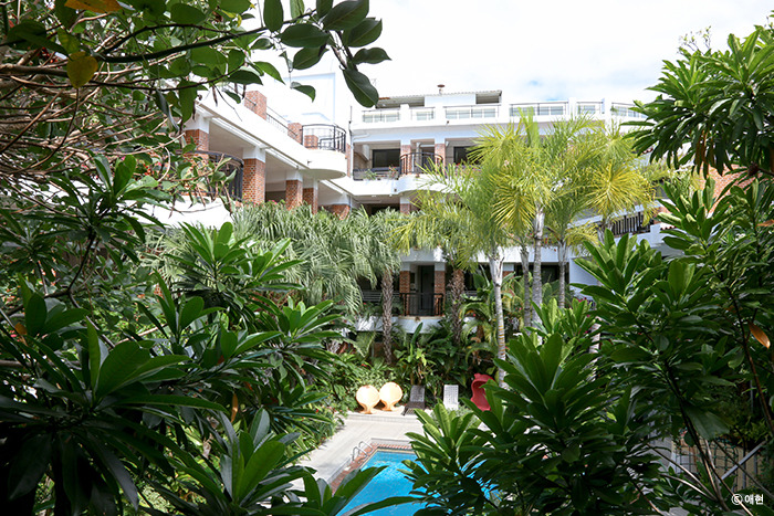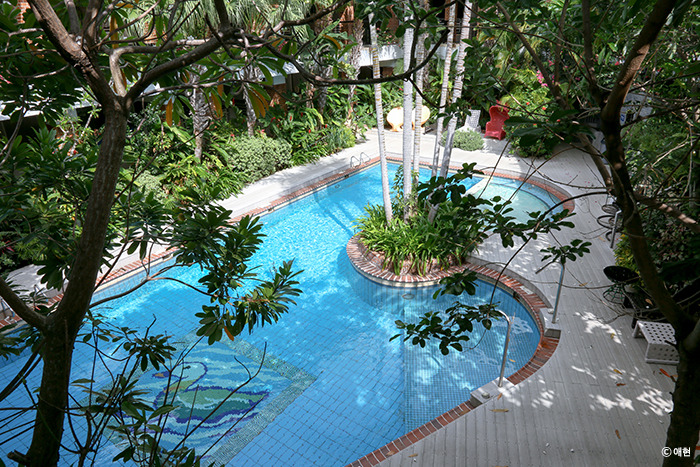 저 멀리 보이는 바다로도 충분한데 당장 이렇게 가까이에 있는 호텔 수영장마저 예쁘다니. 어제부터 내내 후회했지만 오늘 하루도 하루 종일 "컨딩에서 하루 더 묵었어야 해."라고 후회하게 생겼다.