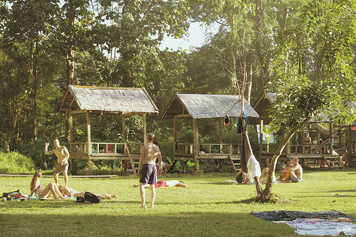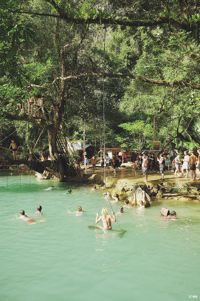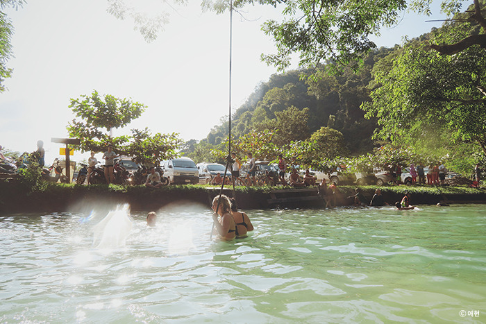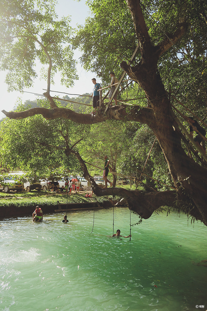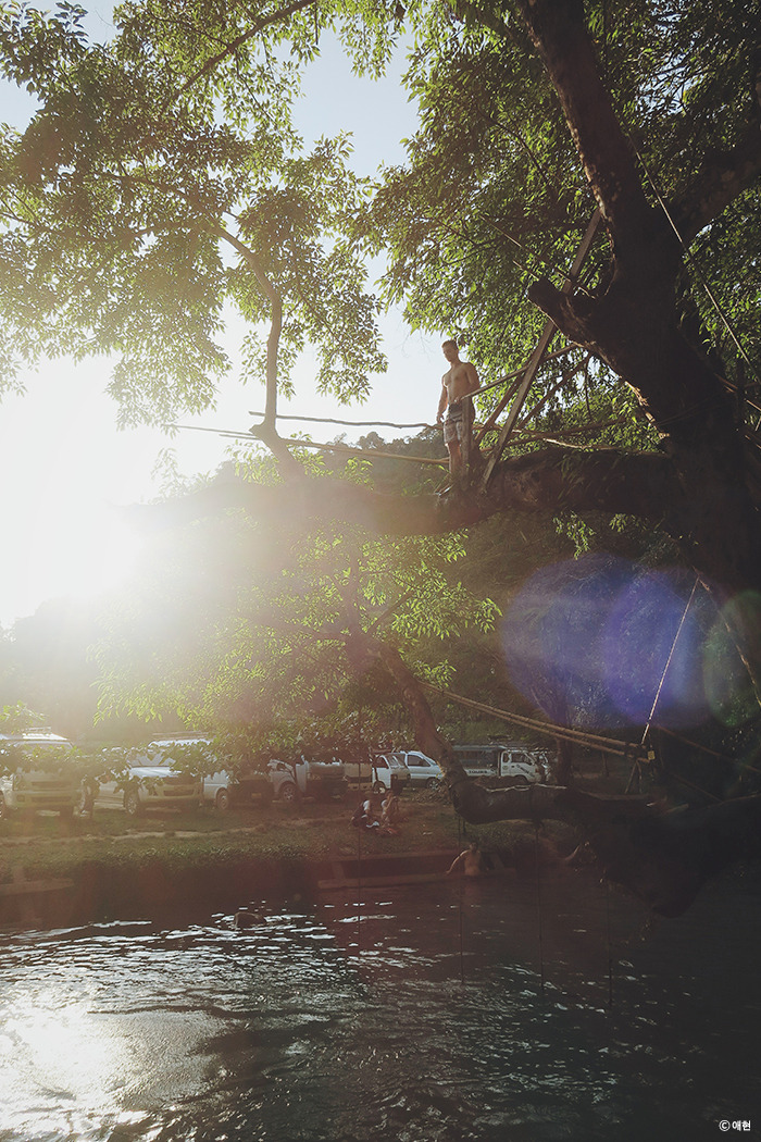 여기서도 그렇고 루앙프라방의 꽝시 폭포에서도 그렇고 다들 다이빙을 좋아하는 건지 시도 때도 없이 다이빙을 했다. 커다란 나무의 커다란 가지 두 개가 물가로 뻗어 나와 자연 다이빙대가 되어주었는데 그 위에서 계속해서 사람들이 뛰어내렸다. 지켜보니 뛰었던 사람이 뛰고 또 뛰더라. 그만큼 재밌나 싶어 잠시 혹했지만 수영도 못하는데 다이빙은 어불성설이라 포기했다. 그런 나 대신, 나의 손을 잡아준 프랑스 남자는 몇 번이나 멋있게 뛰어내렸다.
