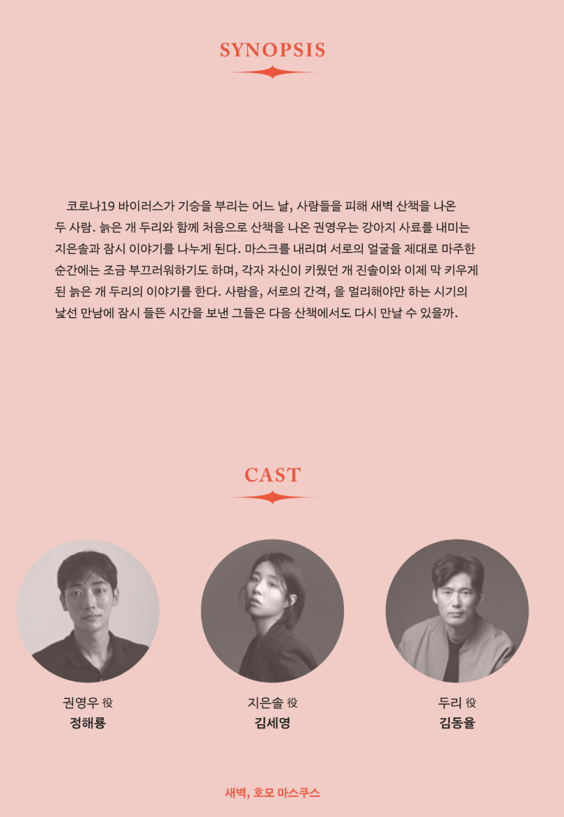 김동율 배우님의 명강아지 연기와 코로나 시절 마스크를 내릴 때 겪었던 뻘쭘함을 포착해 담아냈다는 것이 굉장히 매력적인 작품이었다.