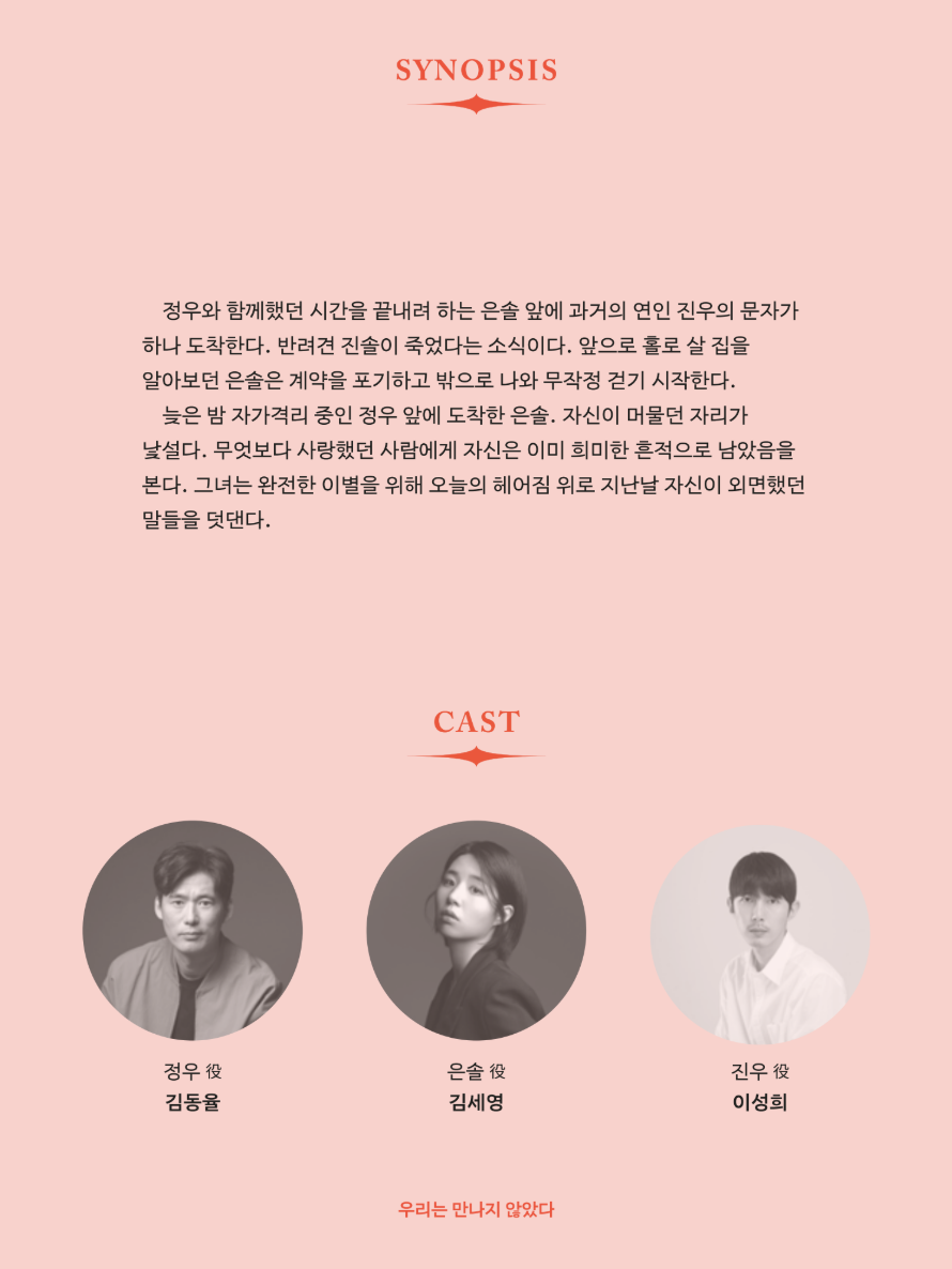 그리고 <우리는 만나지 않았다>에서 단절의 모순을 후벼 파며 단절되었지만 또 단절될 수 없는, 연결되었지만 또 풍부해지지 않는 인간상들을 그려내며 우리가 단절을 극복할 힌트들을 제시한다.