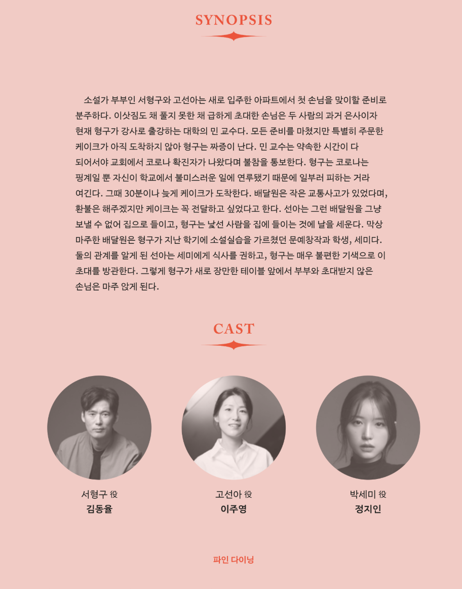 냉소적인 사람들과 삶의 방식 때문에 고민이 깊은 요즘이다. 극에서 형구는 그런 사람이다. 타인을 전혀 들여다보지 못한다. 심지어 자신과 가장 가까운 선아의 잠시 지나가는 어두운 표정과 짧은 침묵조차 눈치채지 못한다. 오로지 자신의 식탁, 명예, 안위가 우선인 사람이다.