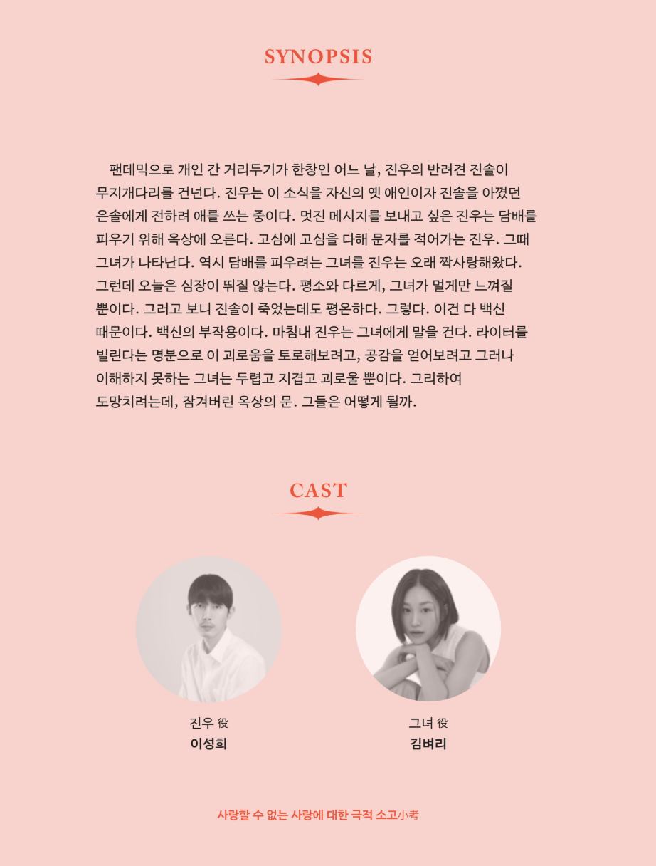 출판사에 다니는 진우와 ‘그녀’는각자 생각을 정리하러, 또 한숨을 돌리러 옥상 위로 올라왔다가 그 옥상에 되려 갇히게 된다. 치열한 그들의 일상 틈에 달콤한 휴식을 취할 수 있는 오아시스 같던 공간에 갇히게 된 것이다. 마치 업무도, 일상도 하지 못한 채 격리되어 갇혀버린 팬데믹 시절의 우리들처럼 말이다.