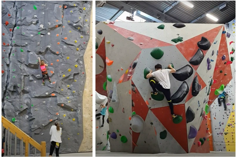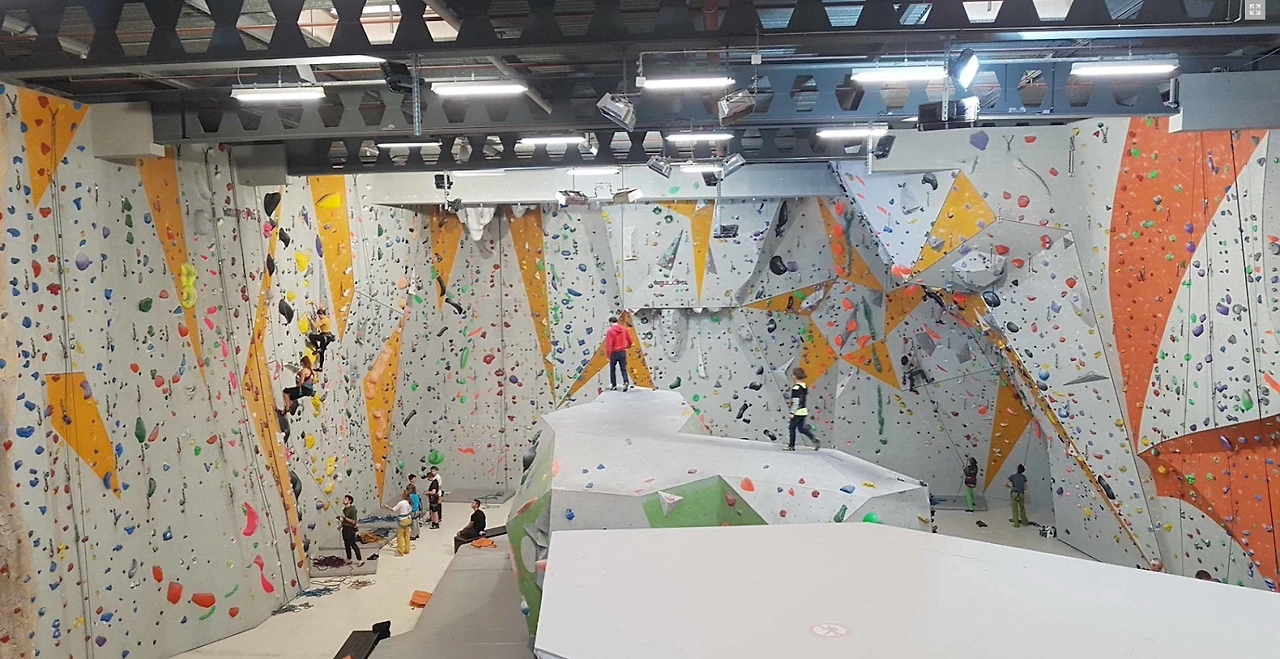 드디어 클라이밍장 앞에 도착했다. 문을 열고 들어선 순간, 그 규모에 압도되었다. 내부는 몇백 평은 되어 보였다. 나는 2층 입구에 서 있었다. 아래를 내려다보니 아일랜드 형태의 볼더링장이 중앙에 있었고, 주위를 족히 10미터는 돼 보이는 리드 클라이밍 벽들이 둘러싸고 있었다.