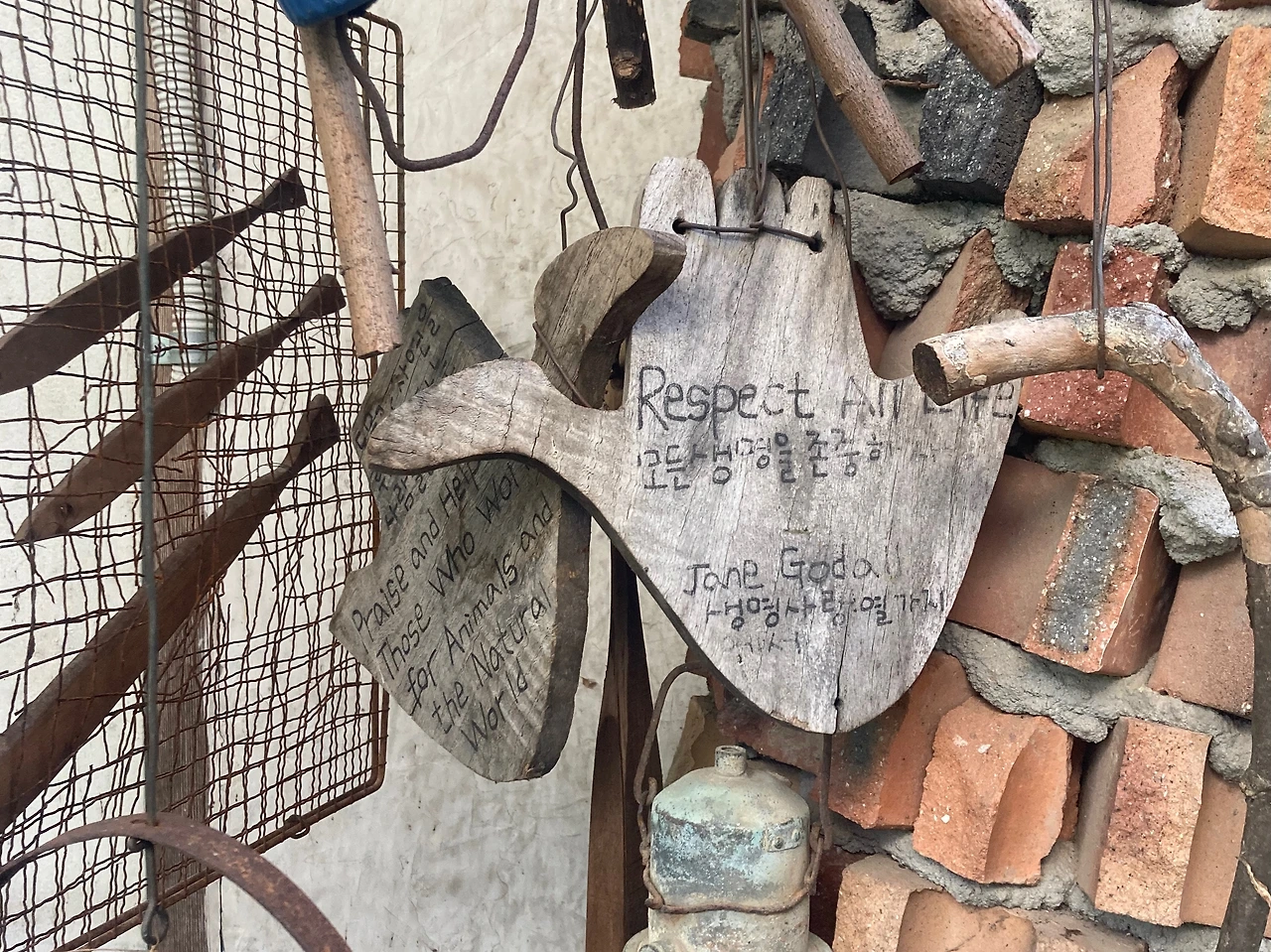 강원도 평창에 산골짜기에 위치한 아담한 카페다. 예술가 주인 내외의 오랜 손길이 닿지 않은 구석 하나 없다. 주워온 가지마다 적힌 그마다의 서사들, 깨진 돌조각들의 배열, 주렁주렁 달린 나무판에 적힌 "Respect All Life"라는 글귀. 이제는 태풍이 불면 어쩌지 하는 현실적인 생각부터 들지만 그래서 이곳에 담긴 부지런함을 안다. 어느 세련된 호텔 정원도 이에 견주기 어려울 정도로 너무 아름다웠다. 사소함의 귀함을 아는 마음, 물건과 자연과 행동에 깃든 시간에 대한 애정, 돋보기로 들꽃을 자세히 바라보는 마음이 느껴졌던 공간.