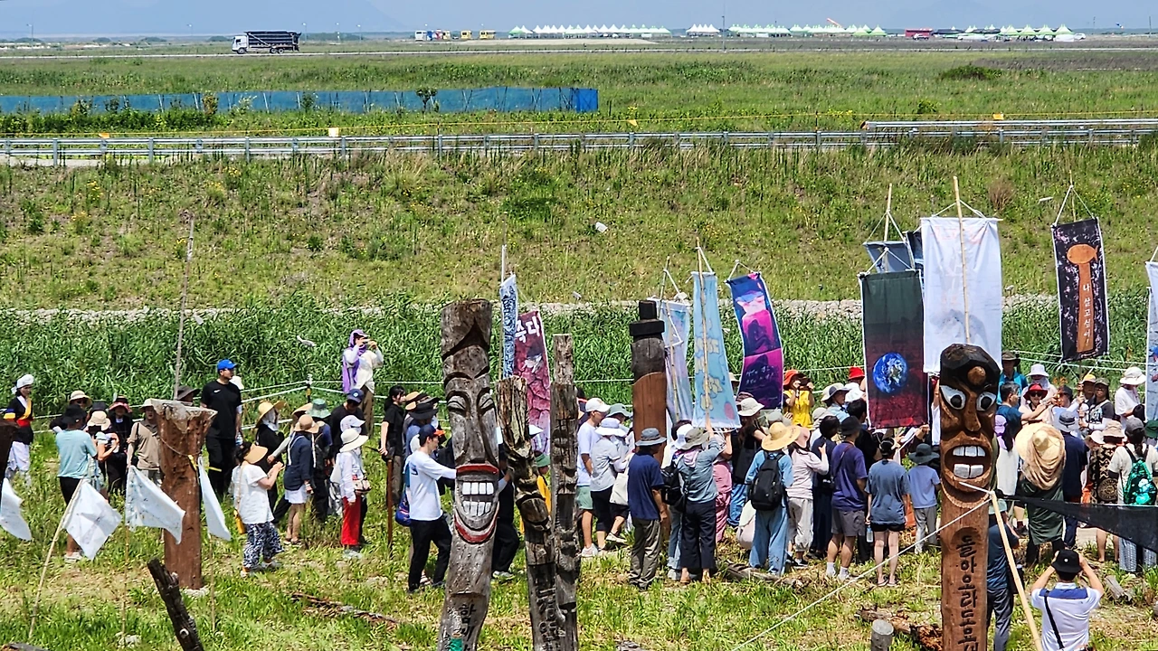 말 많고 탈 많은 잼버리 현장을 지나 해창 갯벌에 도착했다. 미리 도착한 사람들 뒤로 50여 개의 장승들이 보였다. 사람들이 이곳을 '해창 장승벌'이라고 부르는 이유였다. 2003년, 새만금 생명을 살리기 위해 네 명의 성직자들이 이곳에서 서울까지 삼보일배를 떠났다. 기성세대들이 미래세대에게 보내는 사죄였다. 생명운동에 있어서도 중요한 분기점이 됐다. 그 후, 무려 20년이 지났다. 분노한 일도 억울했던 일도 잊힐 법한 시간이다. 그럼에도 불구하고 사람들은 잊지 않고 다시 모였다. 개신교, 천주교, 불교, 원불교의 교당으로 쓰인 네 개의 컨테이너에는 다시 벽화가 그려졌다. 새로 만든 장승들을 힘을 합쳐 세우고, 억울하게 죽어간 뭇 생명들을 위해 제사를 지냈다. 오동필 새만금시민생태조사단장님이 말했다. “장승들도 나이를 먹어 누워계신 분도 계시고, 흙과 같이 사라지신 분도 계십니다. 어린 장승들이 다시 세워지면서 그 뜻을 이어간다고 합니다.” 과거의 오동필 단장님의 의지가 오늘의 아들 승준님에게로 이어진 것처럼 오늘의 목격자는 미래로 계속해서 이어질 것이었다. 제사를 지낸 후에는 함께 음식을 나눠먹으며 각자가 가져온 악기로 공연이 이어졌다. 나는 얼떨결에 무대로 떠밀려나갔고;; 문어의 꿈을 개사한 갯벌의 꿈을 열창하는 급조된 밴드의 일원이 되어 구석에서 의외로(?) 열심히 젬배를 두들겼다. 역시 노래가 있어야 끈질길 수 있다.