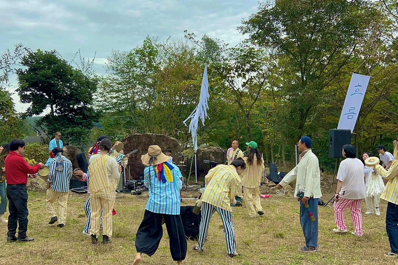 굿을 기획하기 시작한 두 달 전, 해남에 모였던 사람들은 미리 짜 놓기보다는 즉흥적으로 흘러가보자고 했다. 준비굿, 여는굿, 흐름굿, 닫는굿, 정리굿. 축제를 만드는 모든 과정이 그 자체로 굿이 됐다. 혁명이 늪에 빠지면 예술이 앞장서나니. 바람과 음의 기운을 일으키는 풍물놀이를 시작으로 다 함께 악기를 들고 지전을 흔들었다. 둥둥 둥둥 북소리에 덩달아 심장도 둥둥거렸다. 덕이 담긴 음식을 나누며 흐름의 음악을 따라 춤으로 어우러졌다. 무대와 관객의 구분이 무의미했다. 그 누구도 대상화되지 않았다. 진짜 신명이란 온전히 나를 비웠을 때 가능하다는 말을 체감했다. 풍류를 아는 K-힙스터와 평화를 아는 K-히피들의 조우. 대동의 신명이었다.