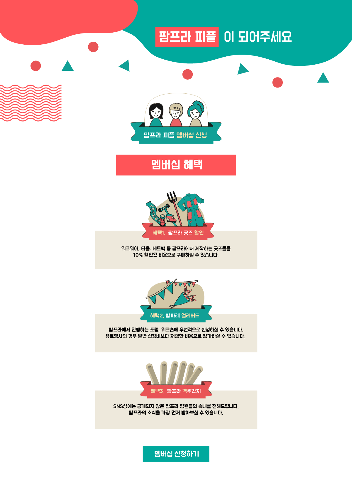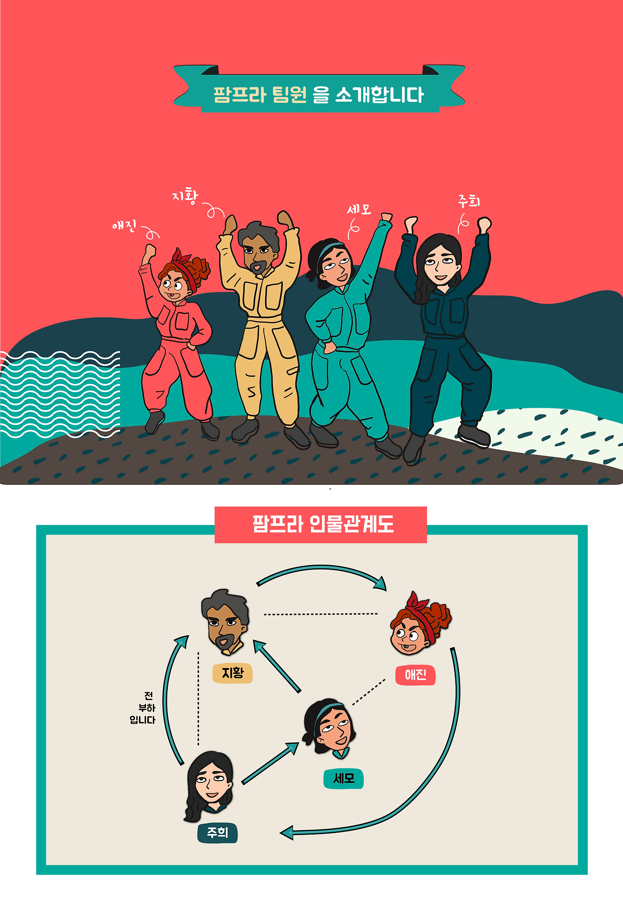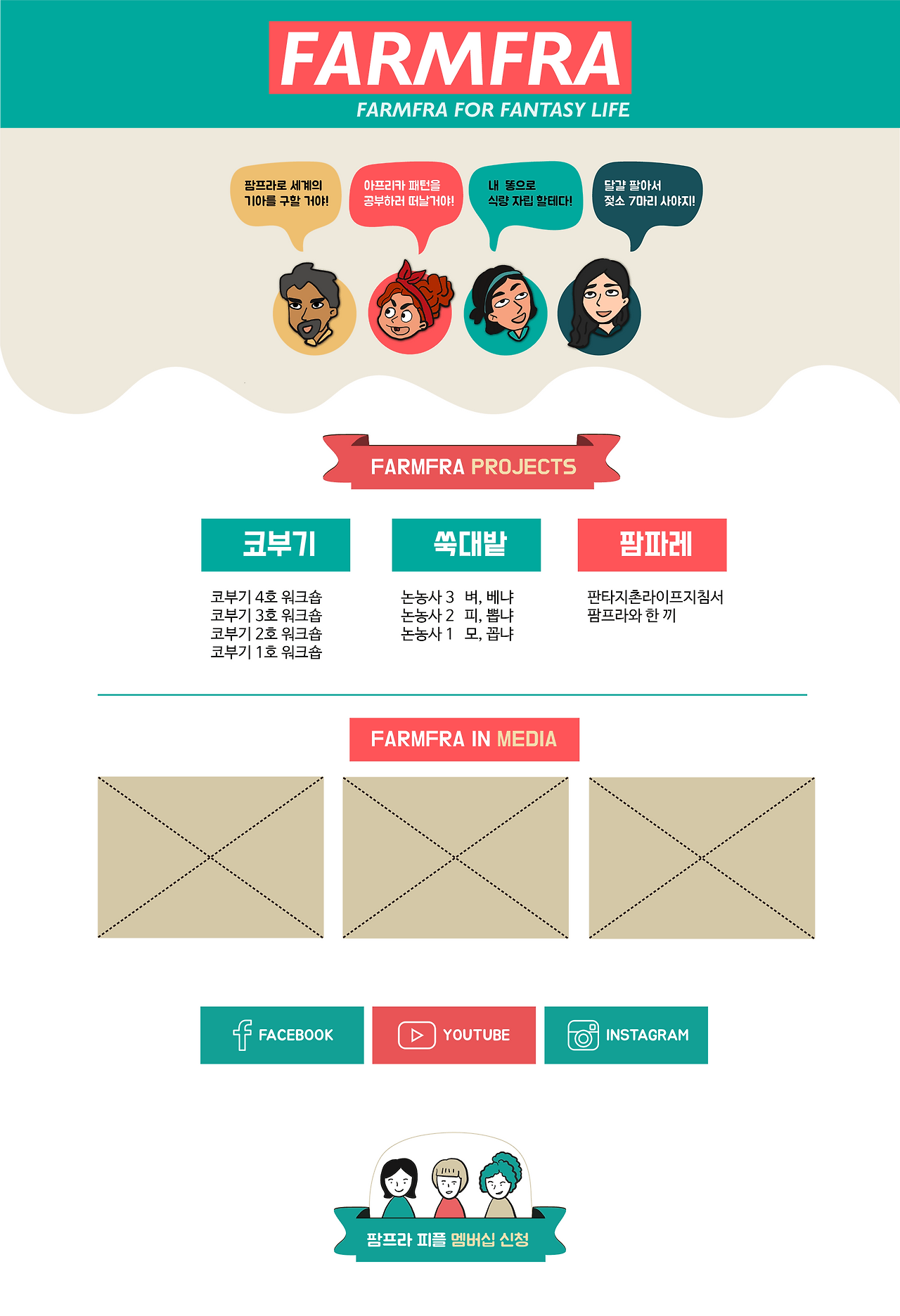 페이스북과 인스타그램은 상대적으로 휘발성이 높아 아카이빙에 적합하지 않았다. 또한 체계적이지 않다 보니 원하는 정보를 검색해서 찾아보기가 어려웠다. 우리에 대해 궁금해진 사람들이 정보를 찾아보려해도 이리저리 흩어져 있었기 때문에 쉽게 접근할 수 없었다. 마케팅과 홍보에는 용이하나 커뮤니티 형성에는 제한도 있다. 때문에 아카이빙과 정보소개, 팜피 커뮤니티를 목적으로 한 다른 채널이 필요했다. 블로그, 카페 등도 생각해보았지만 장기적으로 보았을 때 결국 웹사이트가 되어야 한다고 생각했다. 툴에 대한 고민도 많았다. 확장성과 변용에 대한 우려도 있었으나, 우선은 가장 쉽고 빠르게 제작할 수 있는 ‘아임웹'을 사용했다.