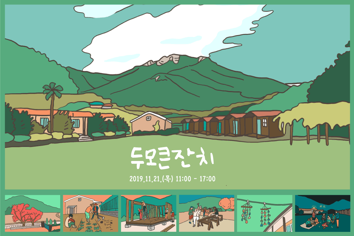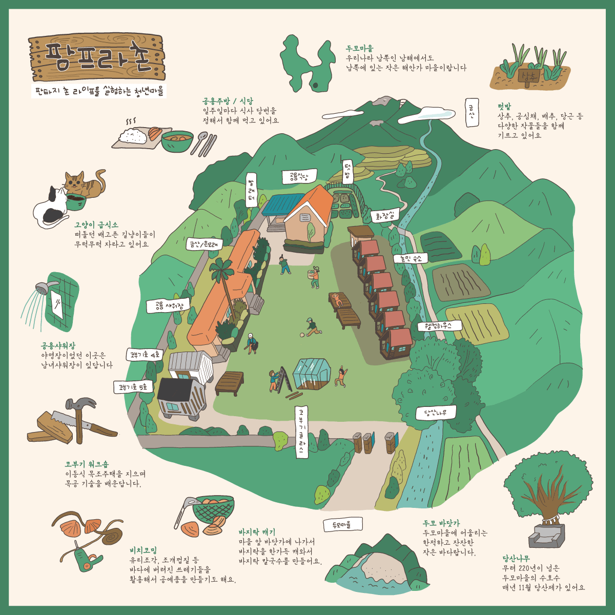 두모마을에 온 팜프라촌민들의 작은 일상 조각들이 모여서 하나의 그림이 되는 퍼즐 같은 그림을 생각했다. 천하제일 못질 대회, 코부기 워크숍, 우드 카빙, 캠프파이어, 비치코밍, 두모마을 사물놀이 등이 모여 이루어지는 팜프라촌을 그렸다. 신기하게도 마을에 들어오기 전과 후의 마을을 보는 내 시선에 차이가 생겼음을 발견했다. 이전의 팜프라촌 지도는 위에서 아래를 내려다보는 시선이었다. 아직 마을에 들어오기 전, 그저 상상하며 기획하던 단계였다. 두모마을은 산도 있고 바다도 있음을 한눈에 보여주고 싶었다. 하지만 정작 마을에 들어와 보니, 가장 많이 보게 되는 것은 마을 뒷자락에 위풍당당하게 자리한 금산이었다. 그래서 팜프라촌을 바라보는 시선도 아래에서 위로 바뀌게 되었다.