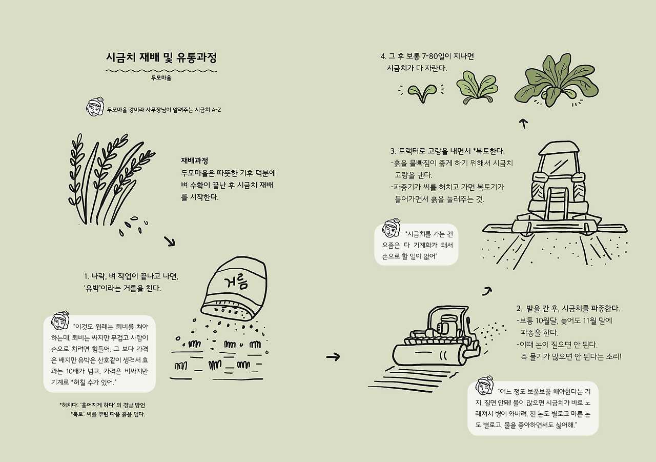 먹거리 이면의 이야기를 들려주는 것 이상으로 먹거리의 원 상태를 보여주는 것 역시 중요하다고 생각했다. 정제되고 다듬어지는 도시 속 농수산물의 모습이 아닌 자연 그대로인 촌의 농수산물의 모습을 아는 것도 호기심의 시발점이 될 것이었다. 그래서 시금치의 뿌리를 자르지 않고 꽃 같은 상태 그대로 보냈다. 동시에 직접 와서 보지 않으면 알 수 없고 생각할 수 없는 것들 역시 존재한다고 생각했다. 그래서 팜투테이블이란 이름으로 직접 이곳에 와서 시금치를 수확하고 시금치 요리를 해보는 시간을 기획했다.
