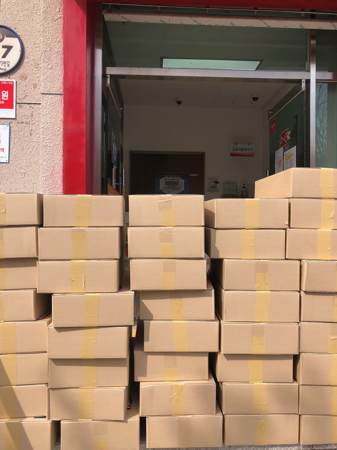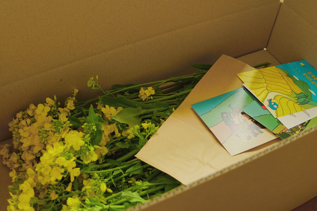 밤새 주문이 폭주하기를 여러 번. 꽃을 딸 때도 샤워를 할 때도 쉴 새 없이 진동음이 울렸다. 며칠 뒤에는 전화가 왔다. "유채꽃축제를 보내드립니다가 인상 깊은데 취재를 할 수 있을까요?" 단 일주일만 판매하려 했던 유채꽃은 방송에 나가자 도저히 물량이 감당 안 될 정도가 되었다. 급하게 일시 품절 공고를 올렸지만 다시 주문창을 열자마자 몇십 건이 순식간에 들어왔다. 매일같이 유채꽃을 따고 있는 우리들을 보며 마을 어르신들은 의아해했다. "유채꽃을 왜 따?" 하염없이 택배를 나르는 우리들을 보며 상주 우체국장님은 또 한 번 놀랬다. "유채꽃을 보낸다고요??" 당연한 반응이었다. 마을에는 어디서나 볼 수 있는 흔하디 흔한 유채꽃이었으니까. 대동강 물을 파는 봉이 김선달이 된 기분이었다.