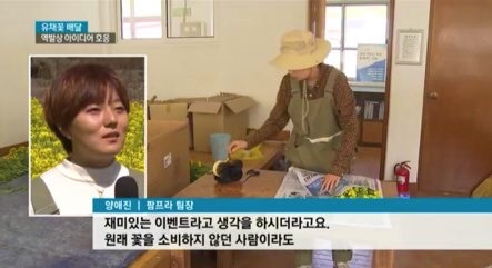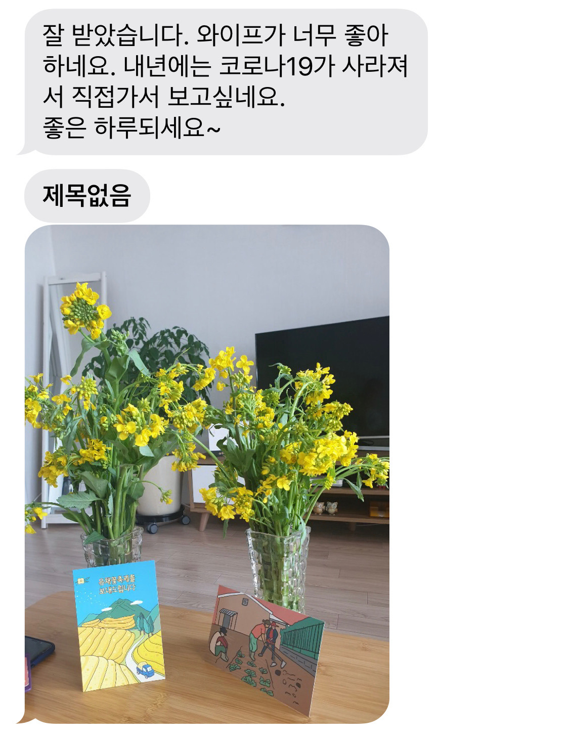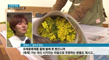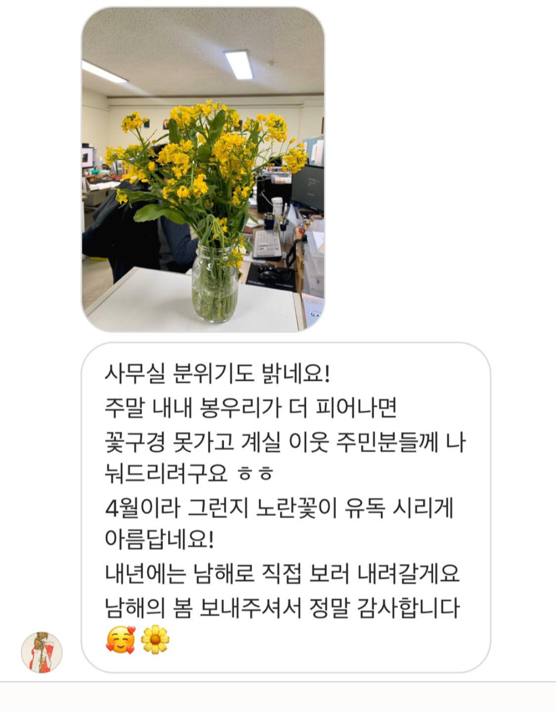 나는 덧붙였다. "코로나 때문에 유채꽃축제도 취소하고 있잖아. 유채꽃축제를 보내드린다고 하는 거 어때?"