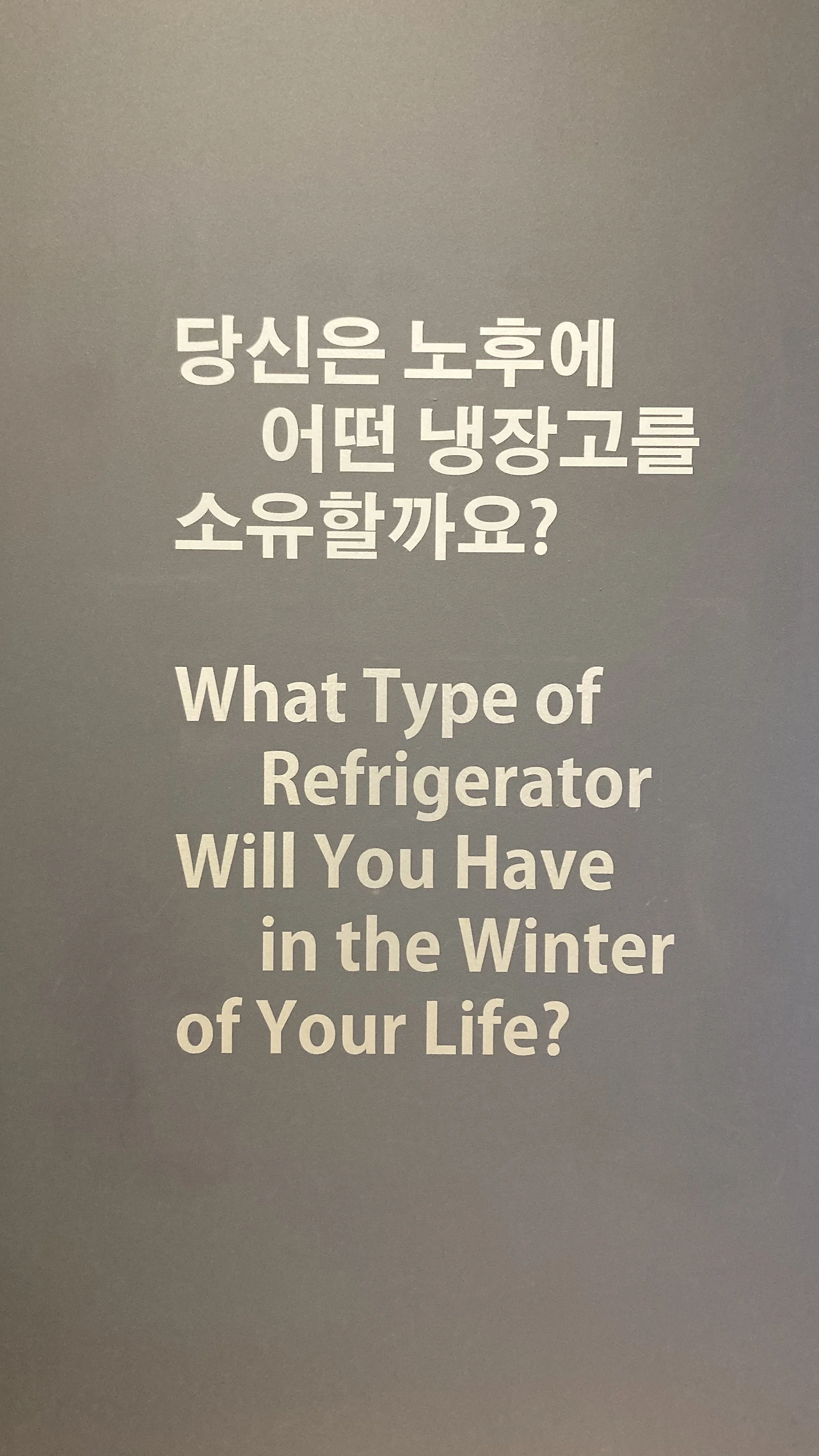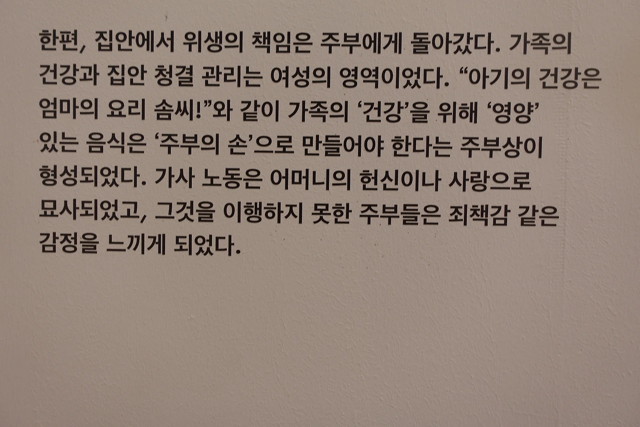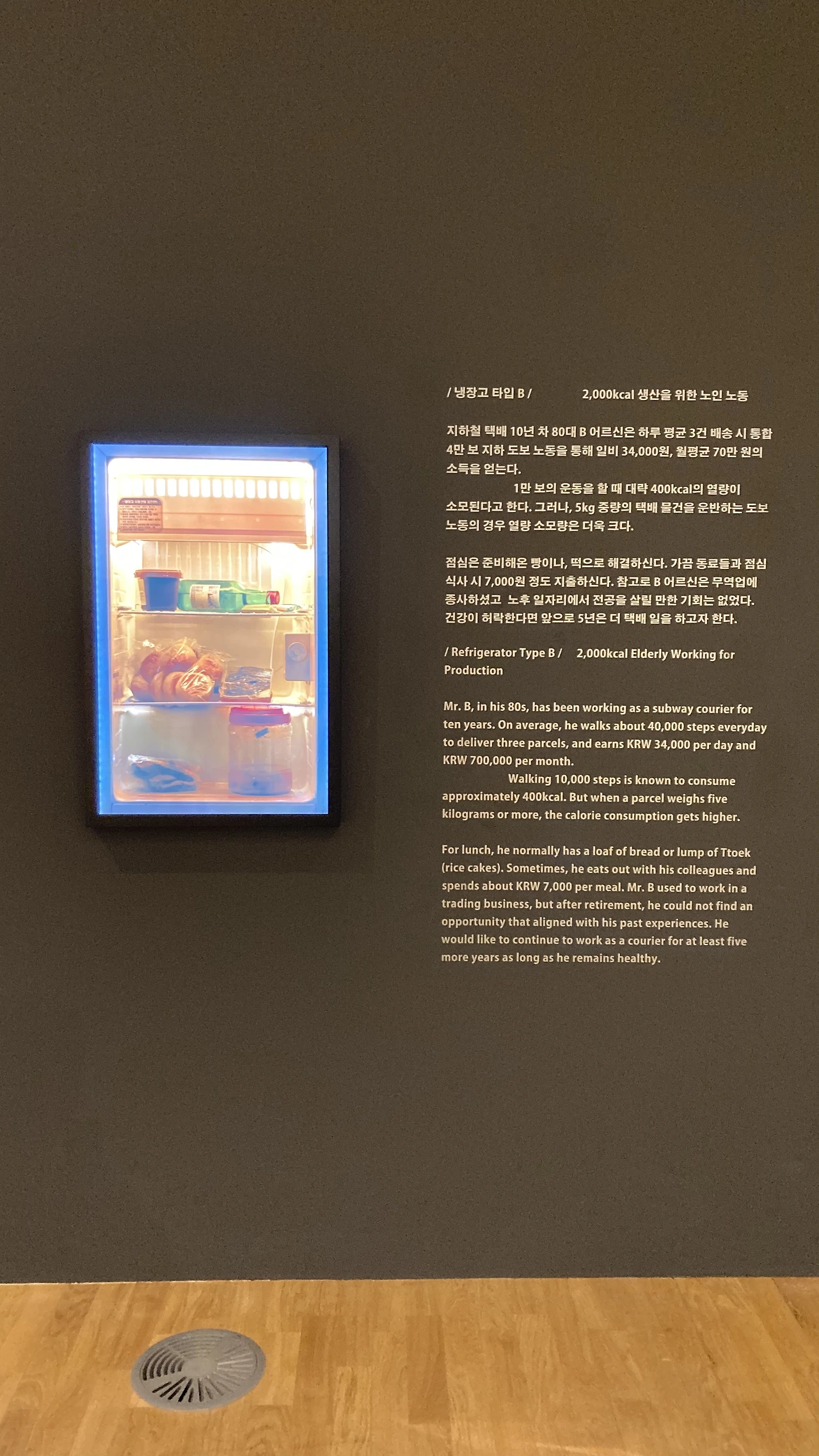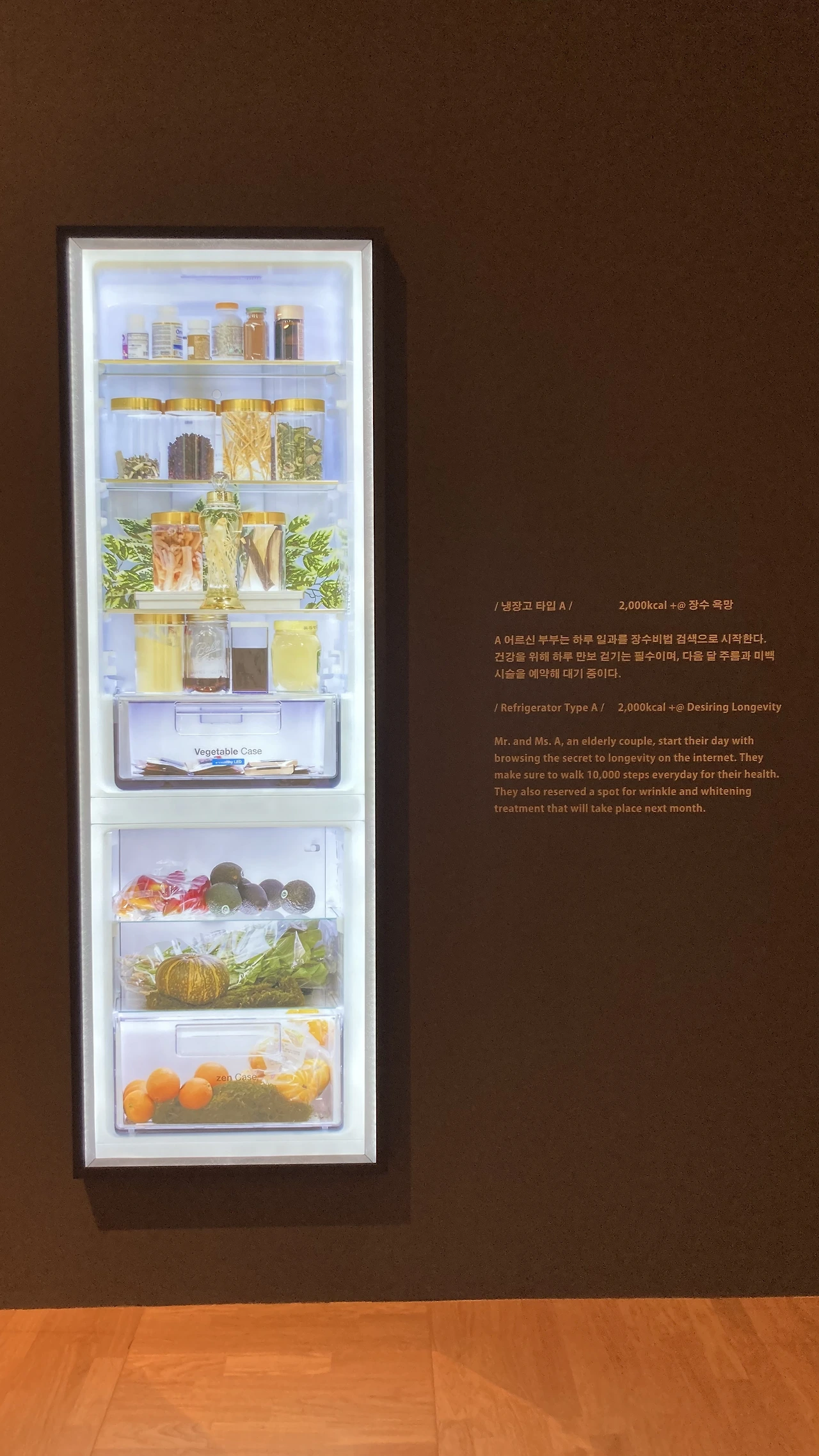 벽면에 크게 적힌 질문 옆에는 세 가지 타입의 냉장고와 이를 통해 드러나는 노년의 일상이 적혀 있었는데, 나는 나중에 소주병만 가득한 냉장고를 가지고 싶지는 않다는 두려움이 일었다. 앞으로 내가 가질 냉장고와 그를 기반한 나의 일상을 상상하며 당장 집에 돌아가면 지금 나의 냉장고를 면밀히 들여다봐야겠다고 다짐했다.(썩어가는 채소 한 개쯤은 분명 있을터..)