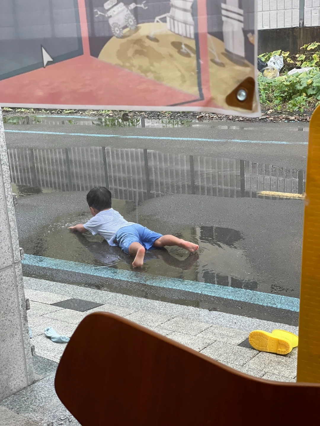 잠시 후 네 시 이 십분 쯔음, 우리 아들이 카페&서점으로 하원했다. 아들은 오늘 샛노란 장화를 신고, 파아란 우산을 들었다. 아들은 비 오는 날을 제일 좋아한다. 내리는 빗소리가 경쾌했고, 빗길을 자박자박 걷는 게 행복했고, 물 웅덩이에 풍덩 발을 빠뜨리는 게 즐거웠다. 무엇보다도 장화를 신고 우산을 드는 비 오는 날은, 발과 손이 풍족한 날이었다. 그런데 사실 오늘 아들은 매우 실망했다. 기껏 장화를 신고 우산을 들고 갔는데 내리는 비를 단 한 방울도 맞지 못했다. 어린이집으로의 등원 길은 아파트 지하주차장을 이용했고, 하원길에는 선생님의 커다란 우산에 완벽 보호되었다. 우산은 내내 찍찍이의 잠금장치 아래 갇혀있었다. 아들은 우산에게도 비를 보여주고 싶었다. 우산에게도 비와 함께 할 수 있는 시간을 주고 싶었다. 그래서 그는 가게 문을 벌컥 박차고 나갔다. 우산에게 비를 맞을 수 있는 충분한 시간을 주었다. 장화에게는 비가 만들어낸 웅덩이에서 수영할 수 있는 기회를 주었다. 그리고 이내 장화와 우산이 배불러 보이자, 모두 벗어던졌다. 장화도, 양말도, 우산도. 그리고 물 웅덩이를 헤엄치기 시작했다. 때론 물개가 되었고, 개구리도 되었다. 웅덩이는 아들이 만들어낸 파동으로 한없이 흔들렸다. 하늘에서 수직으로 내리는 비, 아들의 손짓으로 인해 물결 지는 웅덩이, 회색빛의 구름들과 그 사이에서 내려오는 한줄기의 햇살. 남편과 내 어깨를 다독이는 빗줄기. 피부를 적시는 장마철의 습기. 들려오는 아이의 까르륵 거리는 웃음소리. 오감으로 남는 이 순간을 나와 남편은 앞으로 계속 꺼내어볼 테지.
