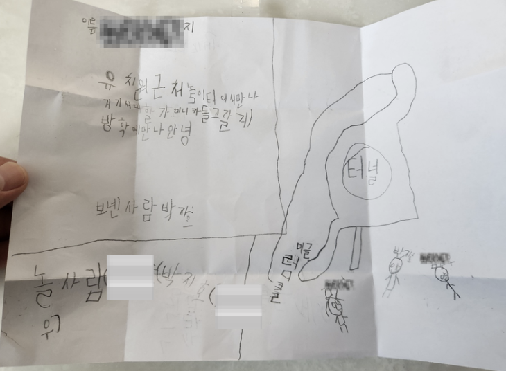 아들은 그 뒤로도 엄마의 심기(?)를 건드리는 말들을 해댔다. '은지랑 결혼해야지' 라든가 '카피바라 키링 두 개 사줘, 은지랑 같이하게'라는 식으로 말이다. 그중에 압권은 이거다. 전날 저녁 아들이 오른손으로 가림막을 만든 채, 왼손으로 무언가를 열심히 적고 있었다. 나는 호기심에 고개를 빼꼼 내밀어봤는데, 아들은 나를 째려보더니 소리쳤다. "보지 마! 멀리가 있어!" 나는 순순히 물러나주었는데, 다음날 아이 유치원 가방에서 그 정체를 알게 되었다. 그건 바로 편지였다.