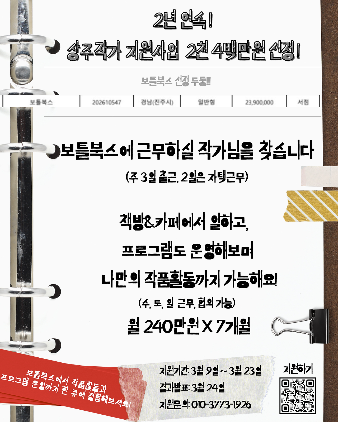 보틀북스가 2년 연속 <문학상주작가 지원사업>에 선정되었습니다 :)