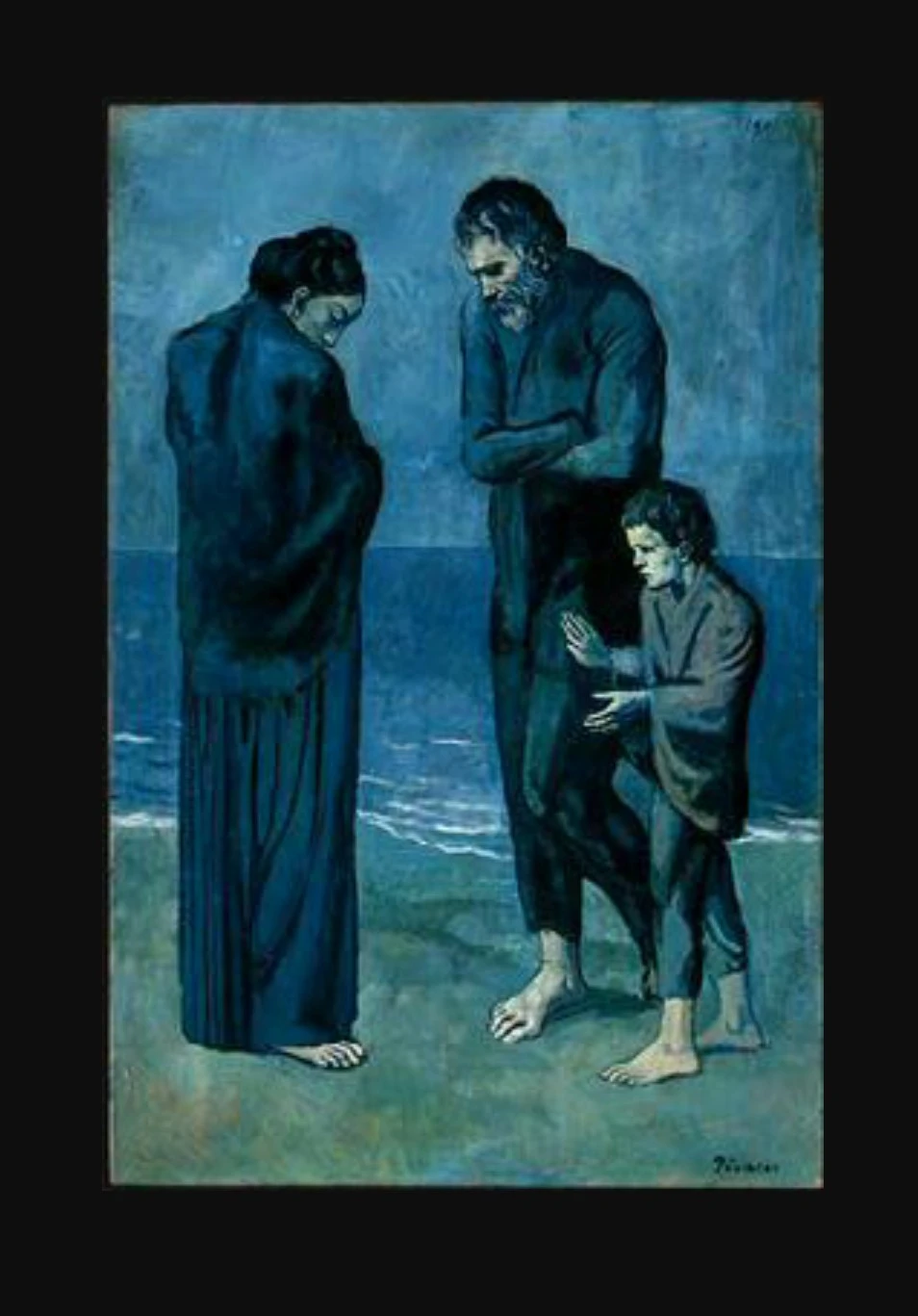 프랑스에서 생활하던 피카소는 화려한 파리의 이면에 숨겨진 비참함과 빈곤에 주목을 한그림들을 제작하죠. 이 당시의 피카소의 화풍을 "청색시대"(1901-1904)라고 부른답니다.