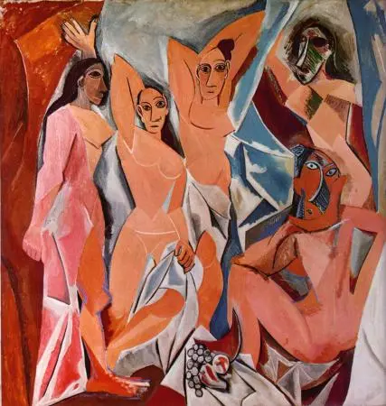 이후 피카소는 폴 세잔, 마티스 같은 화가들과 교류하면서 그림에 있어서 점차 단순화된 형상을 추구하게 돼요. 그리고 1907년 트로 카데르 인류 박물관에 본 흑인 원시 조각품을 보게 됩니다. 피카소는 이 조각품들에 완전히 꽂혀서 새로운 화풍을 완성하게 되죠. 바로 <아비뇽의 처녀들>!!