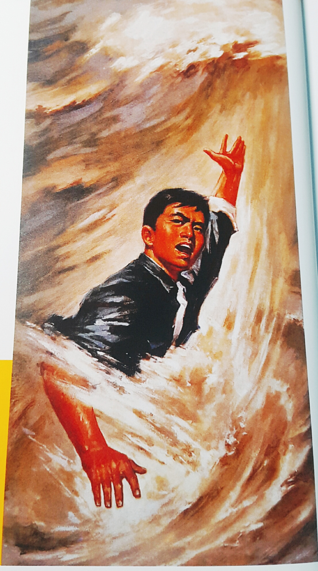남학생이 마오쩌둥주석의 하방(下放)지시에 따라 시골 흑룡강지역에서 복무를 하던중 홍수가터졌고, 전신주를 건져내려다 목숨을 잃은 사건을 기리기 위해 제작되었다. 한 학생을 극적인 제스쳐와 과장된표정을 통해 혁명영웅으로 묘사해내었다.