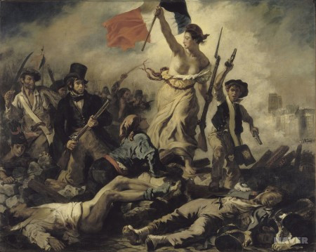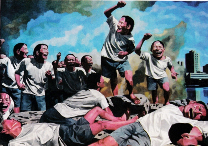 특유의 실없이 크게 웃는 하지만 즐거움이라곤 느껴지지않는 허무한 미소를 날리고있다. 이 작품은 낭만주의 작가 들라크루아의 유명한 그림 <민중을이끄는 자유의 여신>을 패러디한것이다. 두 작품을 비교해보면, 프랑스혁명 당시를 묘사한 웅장하고 성스러운 에너지가 느껴지는 전작품에 반해 유에민준의 작품에선 오합지졸들이 중구난방으로 모여있는듯한 느낌만 들 뿐이다. 마치 상업광고의 한장면을 보는 듯한 화면배치 방식을 통해 작가는 사회를 조롱하고 비웃는 것만 같다.