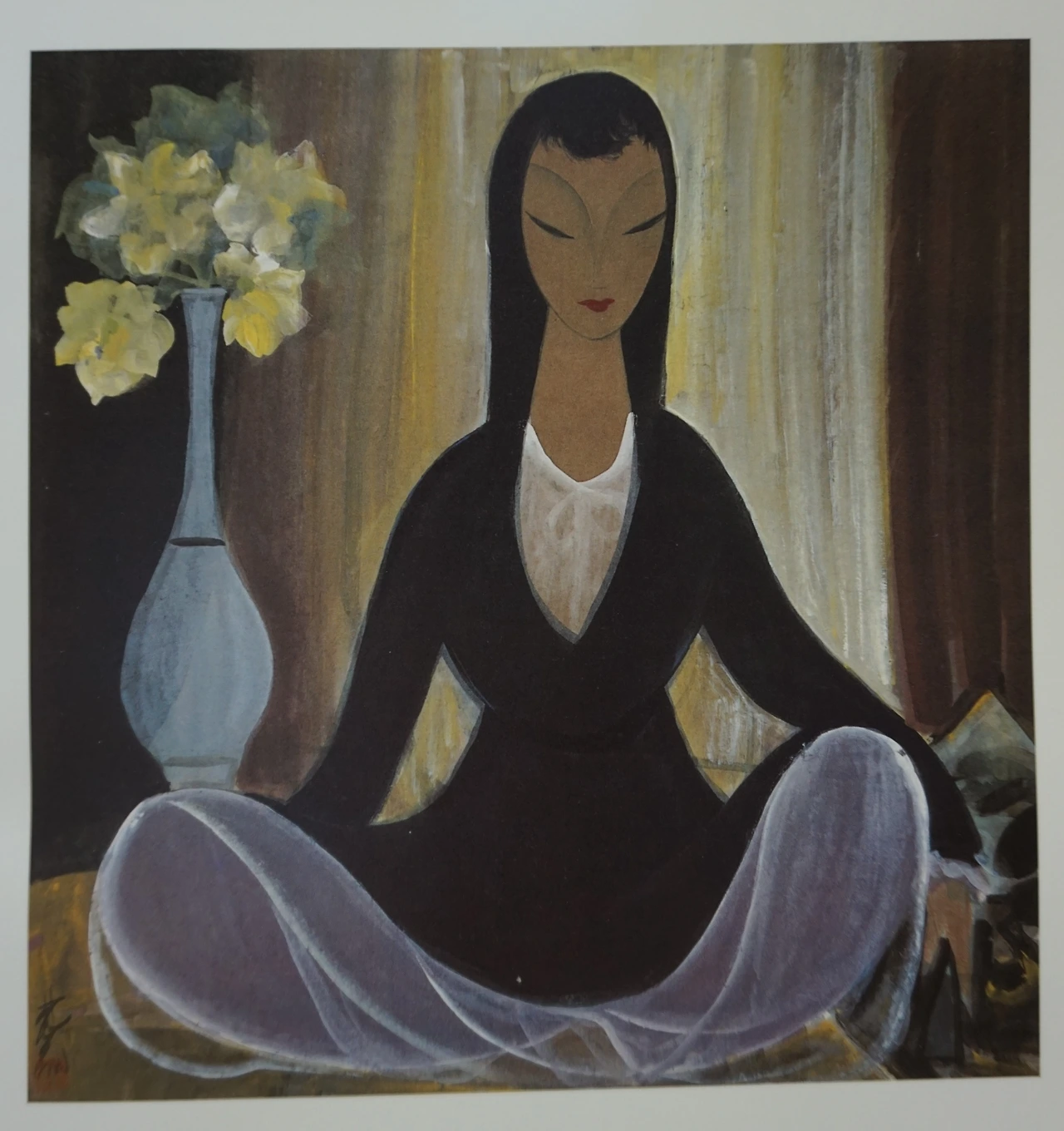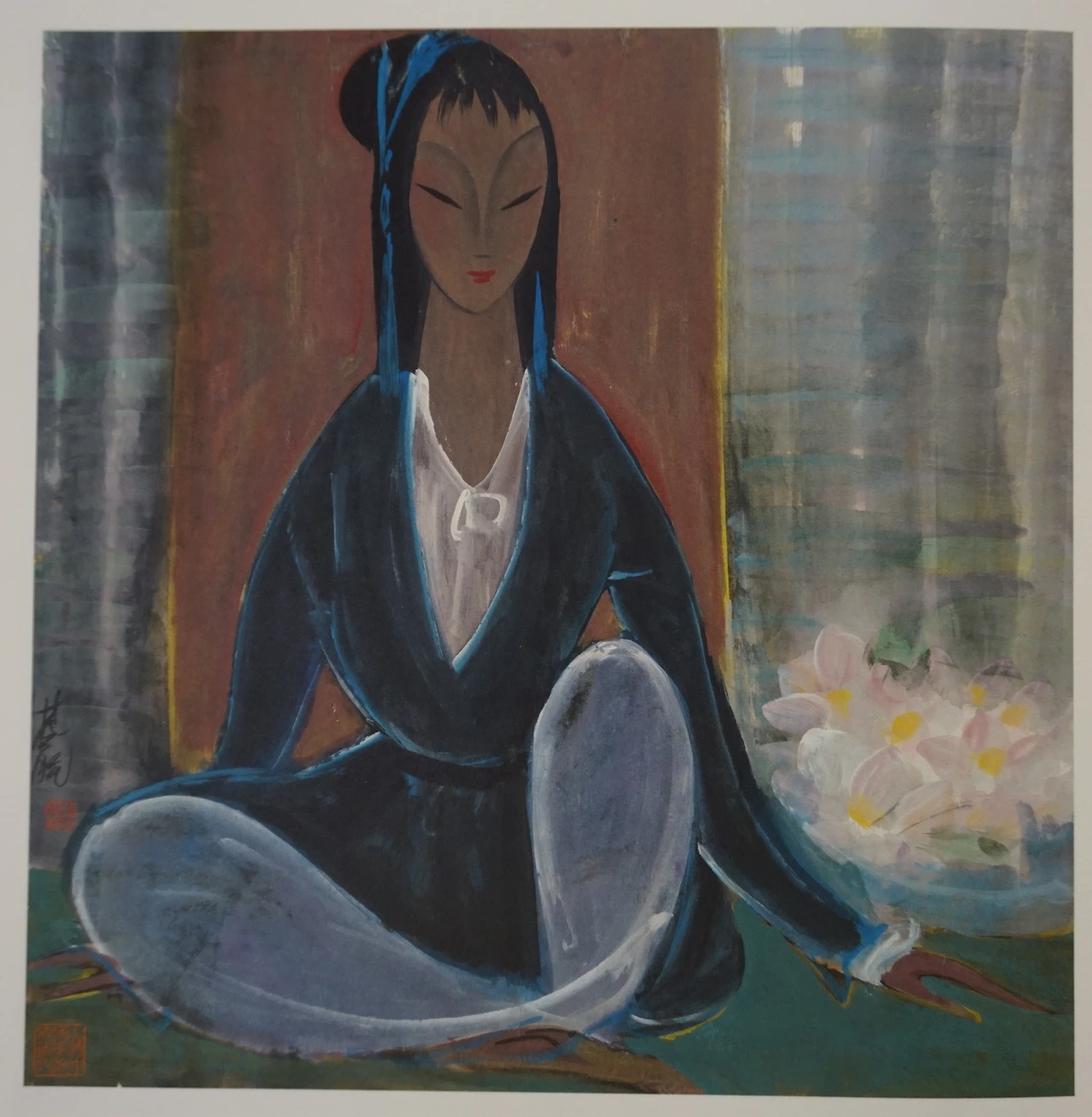 먼저 그는 수묵으로 인체와 배경의 윤곽선을 그렸고,그 후에 전체적으로 담채 채색을 진행했다. 소재에 있어서는 전통적인 요소들이 많이 보인다. 먼저 손에 비파로 보이는 악기와 중국전통의상을 통해 고전복장의 중국여성임을 쉽게 알아챌수 있다.하지만 이 그림속에는 동양의 것만이 존재하는것은 아니다. 화가는 청년시절 프랑스유학 기간동안 배웠던 서양현대미술의 핵심을 그의 작품속에 녹여냈다. 화가는 근대라는 불안정하고 흔들리는 시기에 미술로 현실을 개혁하고자 했다. 보수적인 중국전통예술을 개혁하고자 ‘서양미술’의 핵심을 그것에 접목시키고자 했다. 이러한 예술운동을 중서융합이라 부르는데, 화가는 중국 중서융합 운동의 대표적인 선구자였다.