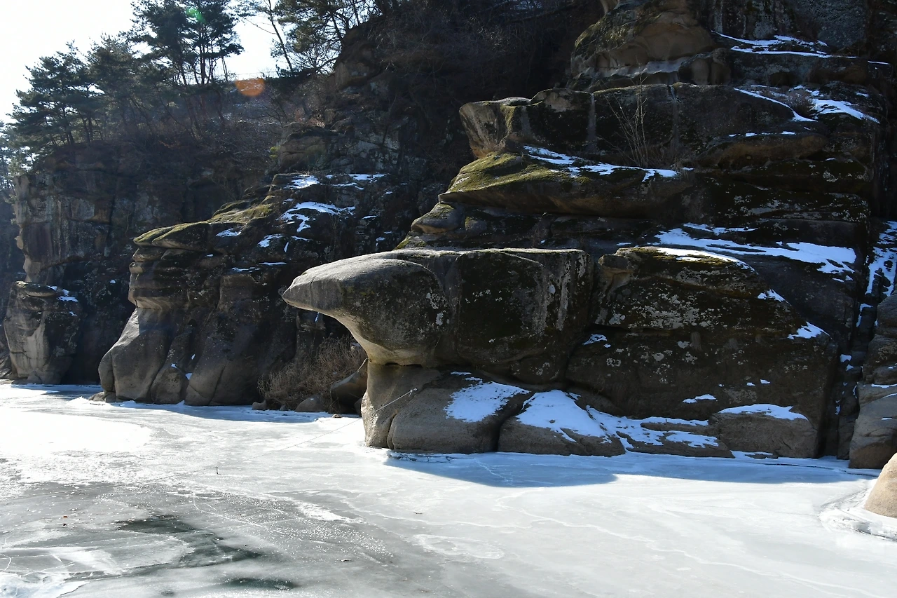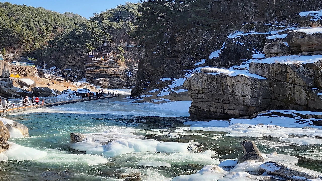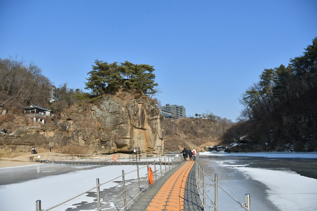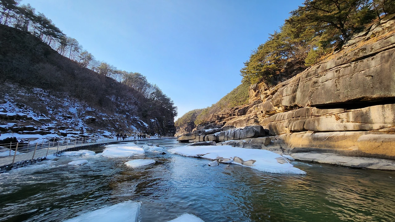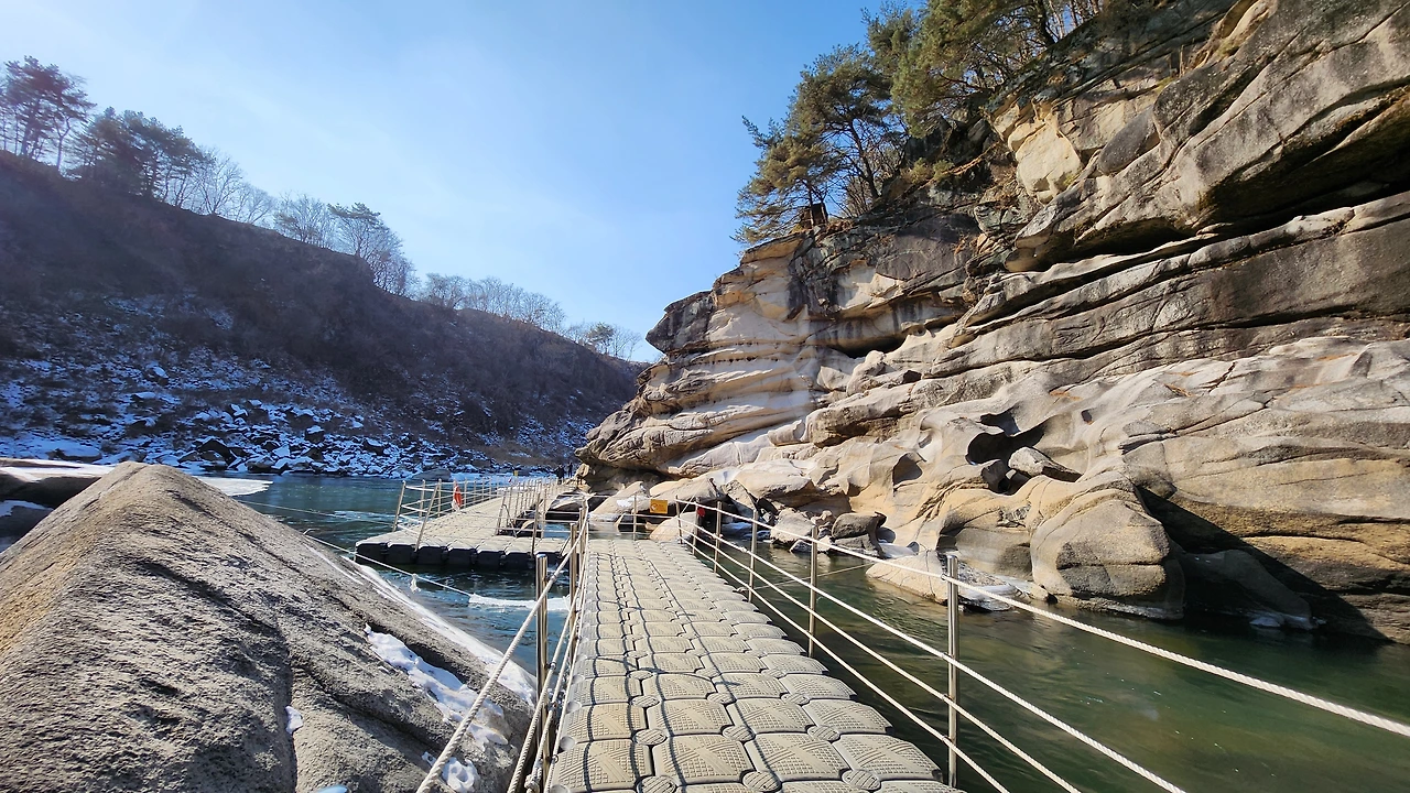 꽁꽁 언 강물 위에 놓인 부표다리는 많은 구간이 얼음 속에 갇혀 고요했다. 출렁임 없는 길을 걸어도 마법을 지닌 용암이 조각한 바위들을 보노라니 지루할 틈이 없었다. 다리가 제법 묵직해질 즈음, 마지막 고비인 가파른 계단이 나타났다. 턱 끝까지 차오르는 숨을 몰아쉬며 겨우 한 계단씩 발을 떼고 있을 때, 어느새 부녀의 목소리가 등 뒤까지 바짝 붙어 있었다.