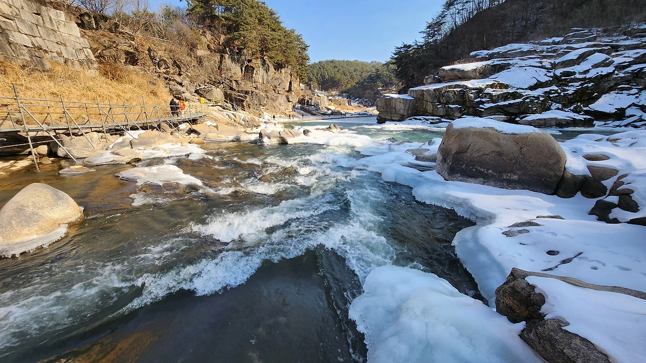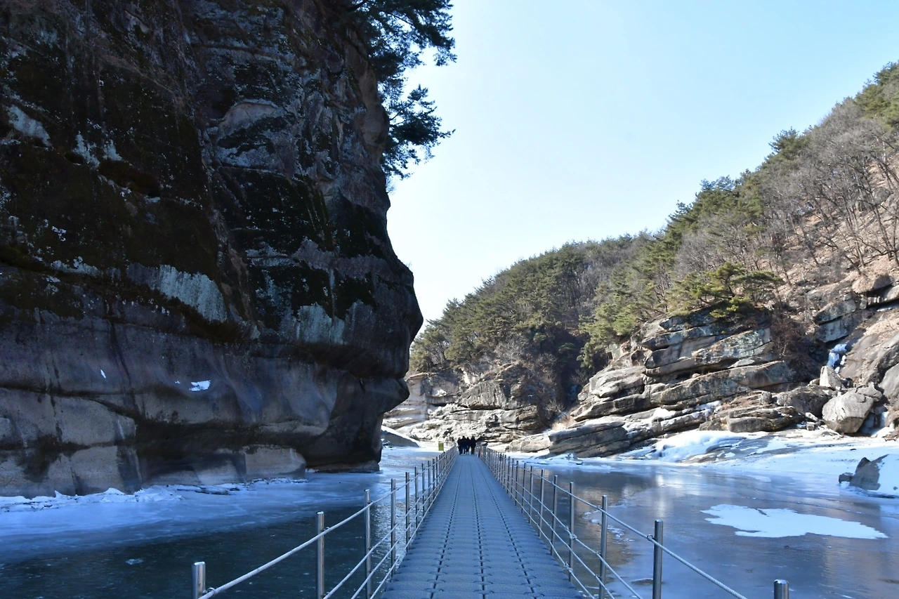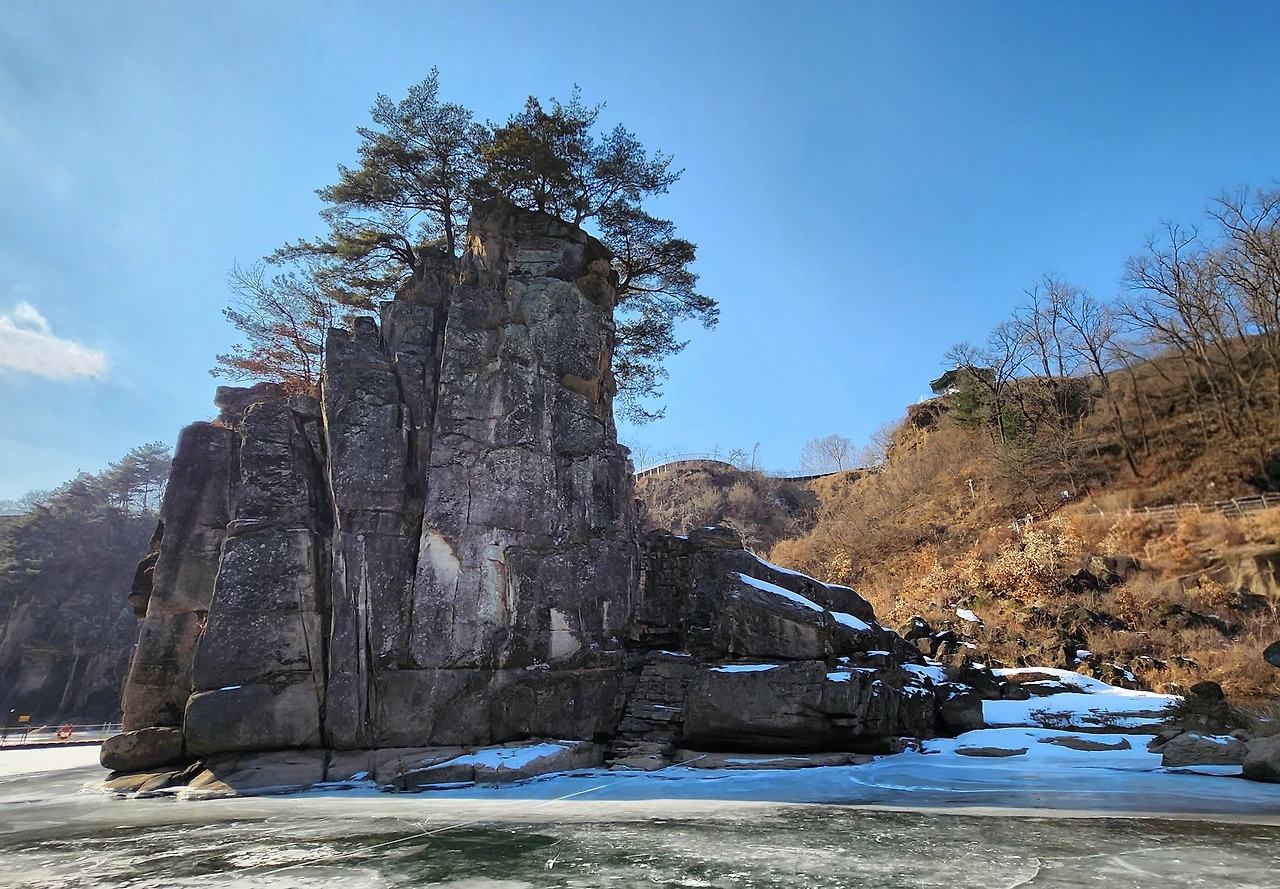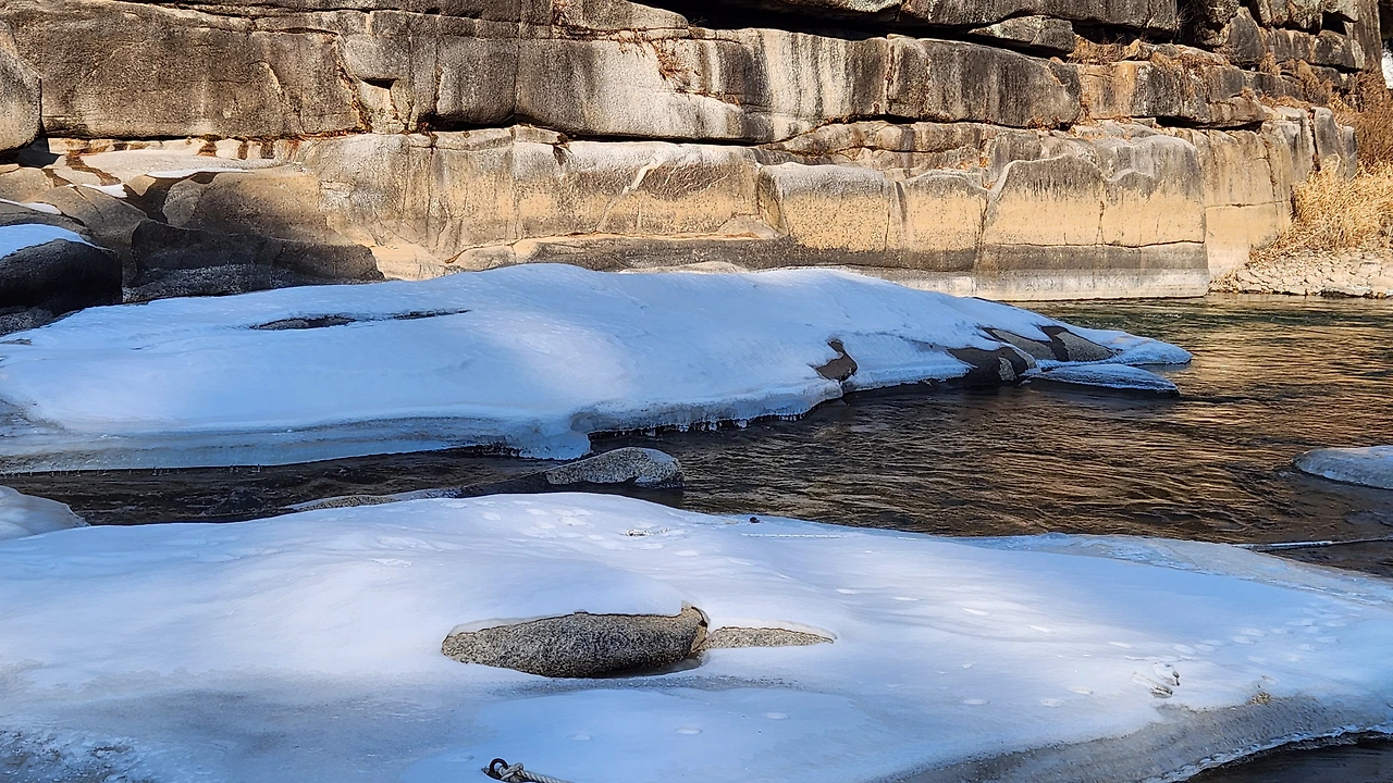 꽁꽁 언 강물 위에 놓인 부표다리는 많은 구간이 얼음 속에 갇혀 고요했다. 출렁임 없는 길을 걸어도 마법을 지닌 용암이 조각한 바위들을 보노라니 지루할 틈이 없었다. 다리가 제법 묵직해질 즈음, 마지막 고비인 가파른 계단이 나타났다. 턱 끝까지 차오르는 숨을 몰아쉬며 겨우 한 계단씩 발을 떼고 있을 때, 어느새 부녀의 목소리가 등 뒤까지 바짝 붙어 있었다.