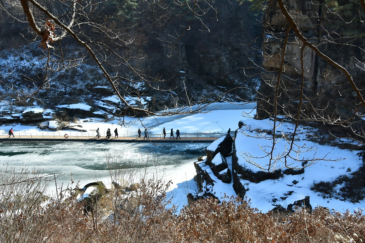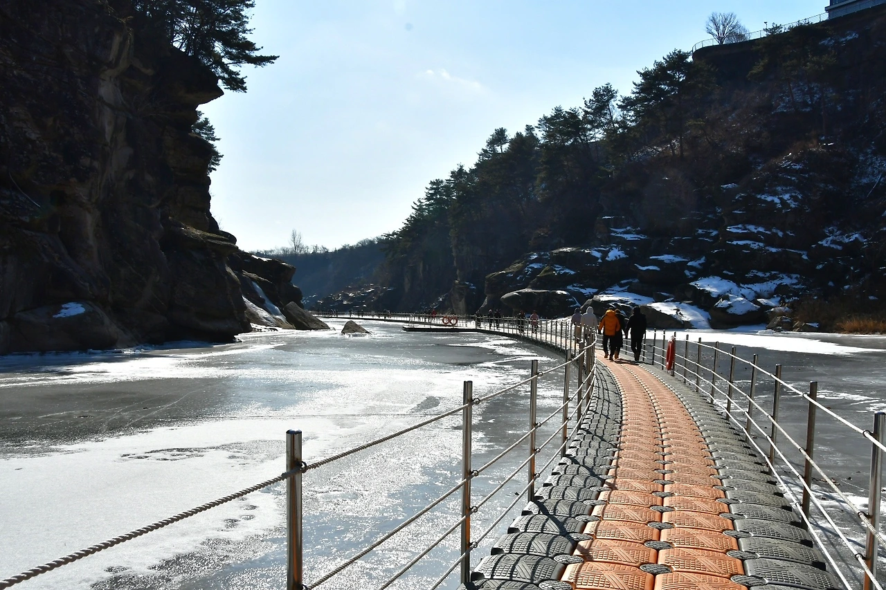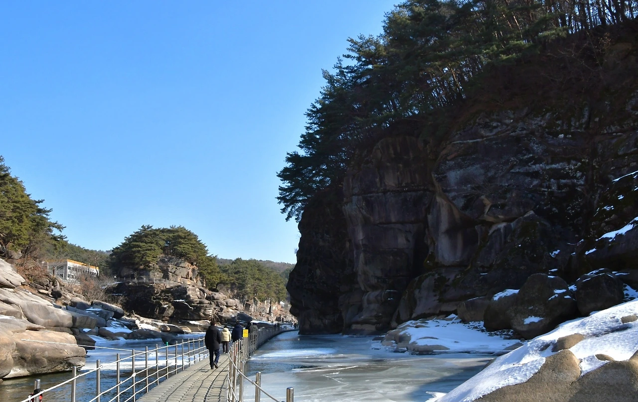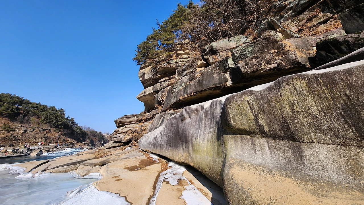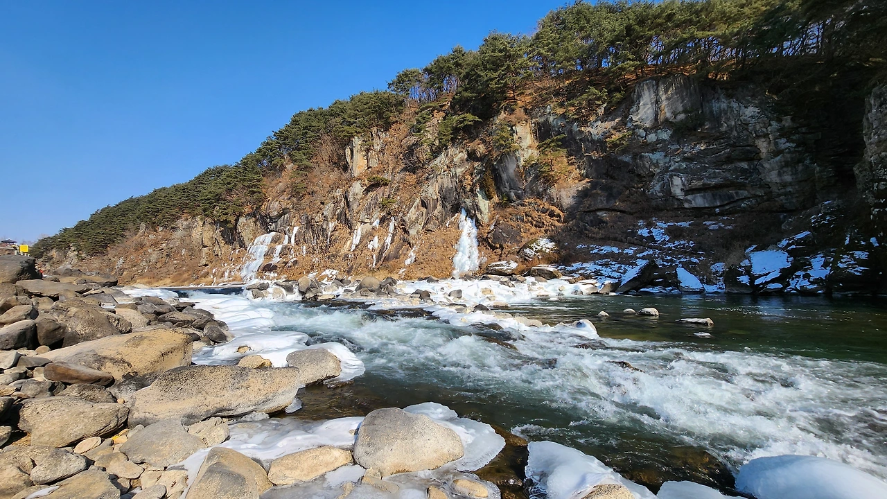 꽁꽁 언 강물 위에 놓인 부표다리는 많은 구간이 얼음 속에 갇혀 고요했다. 출렁임 없는 길을 걸어도 마법을 지닌 용암이 조각한 바위들을 보노라니 지루할 틈이 없었다. 다리가 제법 묵직해질 즈음, 마지막 고비인 가파른 계단이 나타났다. 턱 끝까지 차오르는 숨을 몰아쉬며 겨우 한 계단씩 발을 떼고 있을 때, 어느새 부녀의 목소리가 등 뒤까지 바짝 붙어 있었다.